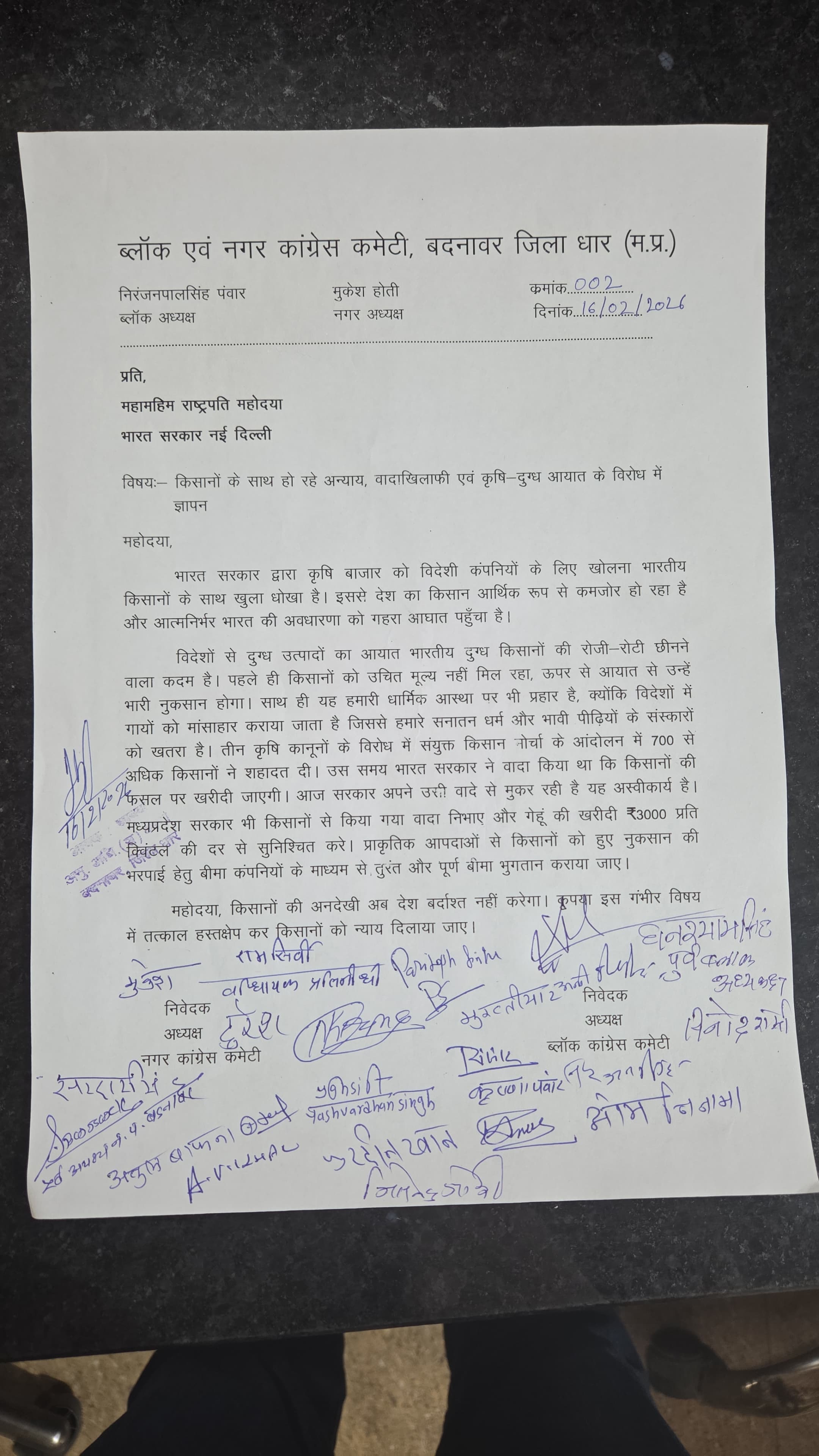 बदनावर । ब्लॉक एवं नगर कांग्रेस कमेटी, बदनावर द्वारा महामहिम राष्ट्रपति के नाम ज्ञापन प्रेषित कर किसानों के साथ हो रहे कथित अन्याय, वादाखिलाफी एवं विदेशी कृषि-दूध उत्पादों के आयात का विरोध दर्ज कराया गया।
