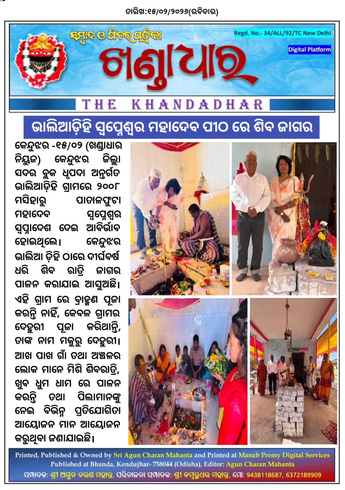 କେନ୍ଦୁଝର -୧୫/୦୨(ଖଣ୍ଡାଧାର ନିୟୁଜ) କେନ୍ଦୁଝର ଜିଲ୍ଲା ସଦର ବ୍ଲକ ଧୃପଦା ଅନ୍ତର୍ଗତ ଭାଲିଆଡ଼ିହି ଗ୍ରାମରେ ୨୦୦୮ ମସିହାରୁ ପାତାଳଫୁଟା ମହାଦେବ ସ୍ୱପ୍ନେଶ୍ୱର ସ୍ଵପ୍ନାଦେଶ ଦେଇ ଆବିର୍ଭାବ ହୋଇଥିଲେ l କେନ୍ଦୁଝର ଭାଲିଆ ଡ଼ିହି ଠାରେ ଦୀର୍ଘବର୍ଷ ଧରି ଶିବ ରାତ୍ରି ଜାଗର ପାଳନ କରାଯାଇ ଆସୁଅଛି | ଏହି ଗ୍ରାମ ରେ ବ୍ରାହ୍ମଣ ପୂଜା କରନ୍ତି ନାହିଁ, କେବଳ ଗ୍ରାମର ଦେହୁରୀ ପୂଜା କରିଥାନ୍ତି, ତାଙ୍କ ନାମ ମକୁରୁ ଦେହୁରୀ |ଆଖ ପାଖ ଗାଁ ତଥା ଅଞ୍ଚଳର ଲୋକ ମାନେ ମିଶି ଶିବରାତ୍ରି, ଖୁଵ ଧୁମ ଧାମ ରେ ପାଳନ କରନ୍ତି ତଥା ପିଲାମାନଙ୍କୁ ନେଇ ବିଭିନ୍ନ ପ୍ରତିଯୋଗିତା ଆୟୋଜନ ମାନ ଆୟୋଜନ କରୁଥିବା ଜଣାଯାଇଛି |
