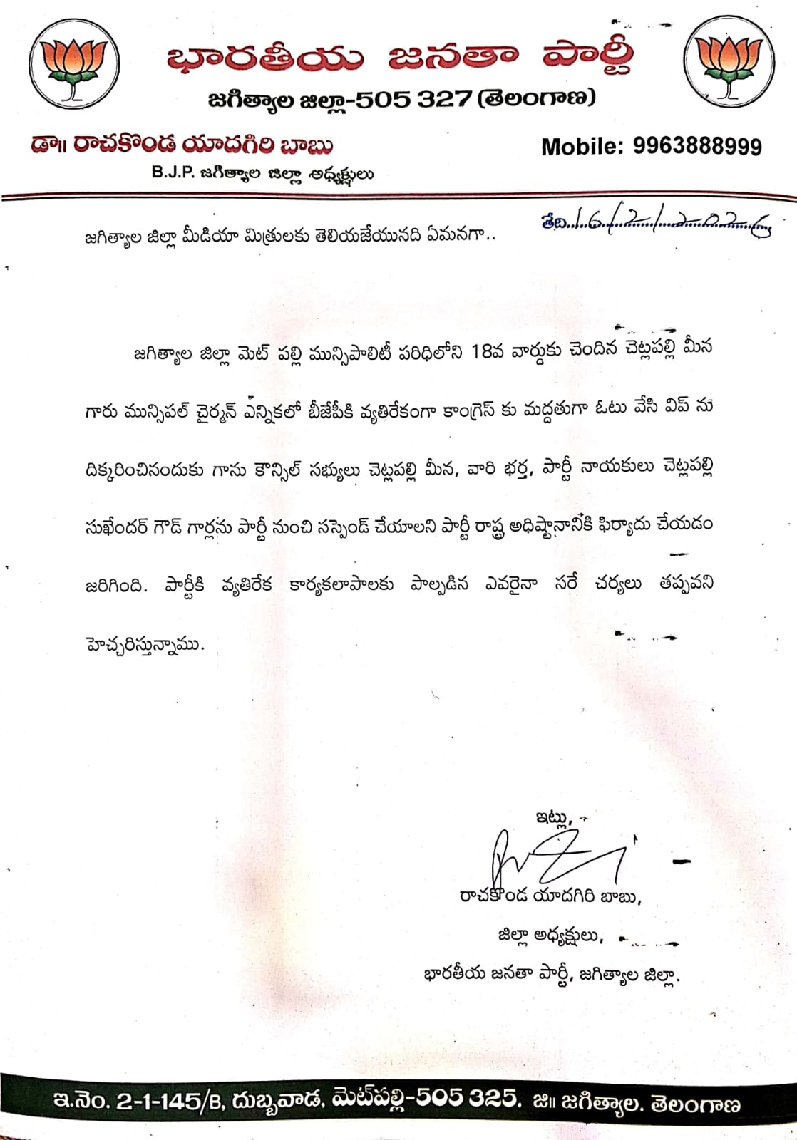 మెట్పల్లి మున్సిపాలిటీలో పార్టీ ఆదేశాలకు విరుద్ధంగా ఓటు వేసినందుకు బీజేపీ కౌన్సిలర్ చెట్లపల్లి మీనా సుఖేందర్ గౌడ్ను పార్టీ నాయకత్వం సస్పెండ్ చేసింది. చైర్పర్సన్ ఎన్నిక సందర్భంగా జారీ చేసిన విప్ను ఉల్లంఘించినట్లు ఆరోపణలు వచ్చాయి.