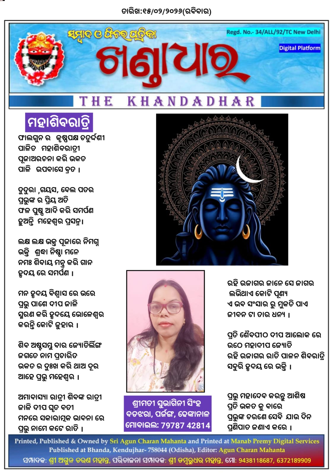 ପ୍ରକାଶନୀ: ସୌଜନ୍ୟ ଡମ୍ବରୁଧର ମହାନ୍ତ, ଖଣ୍ଡାଧାର ନିଉଜ।