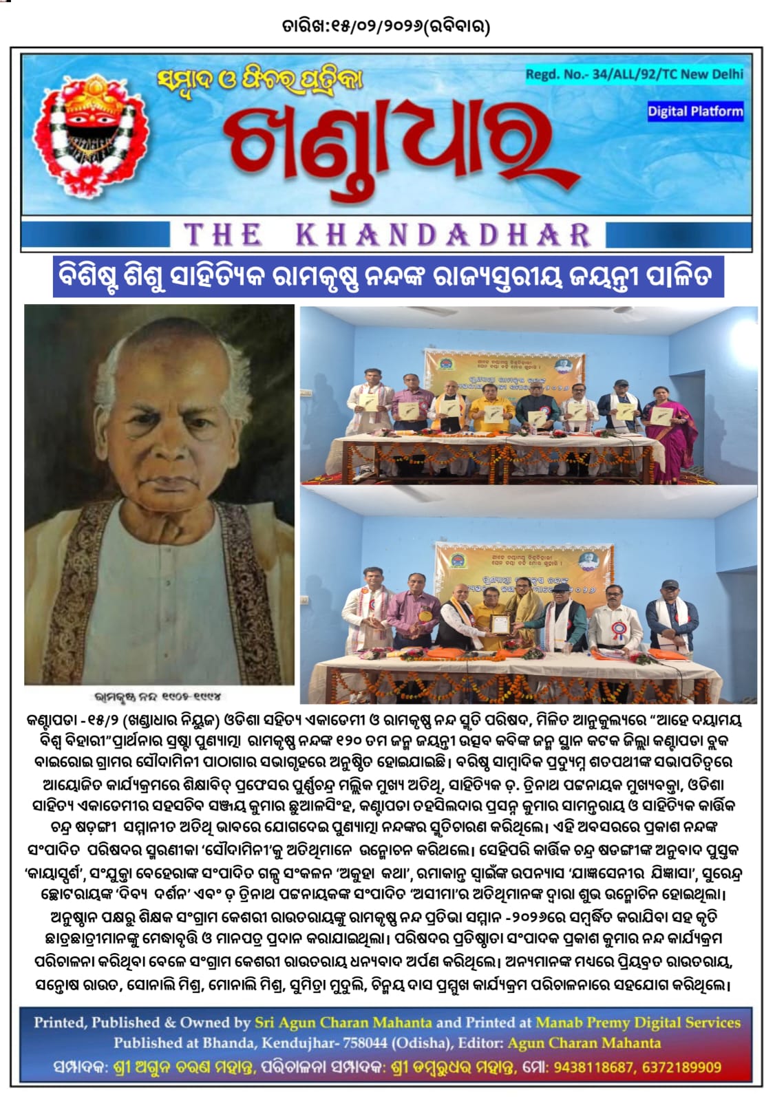 ବିଶିଷ୍ଟ ଶିଶୁ ସାହିତ୍ୟିକ ରାମକୃଷ୍ଣ ନନ୍ଦଙ୍କ ରାଜ୍ୟସ୍ତରୀୟ ଜୟନ୍ତୀ ପlଳିତ।