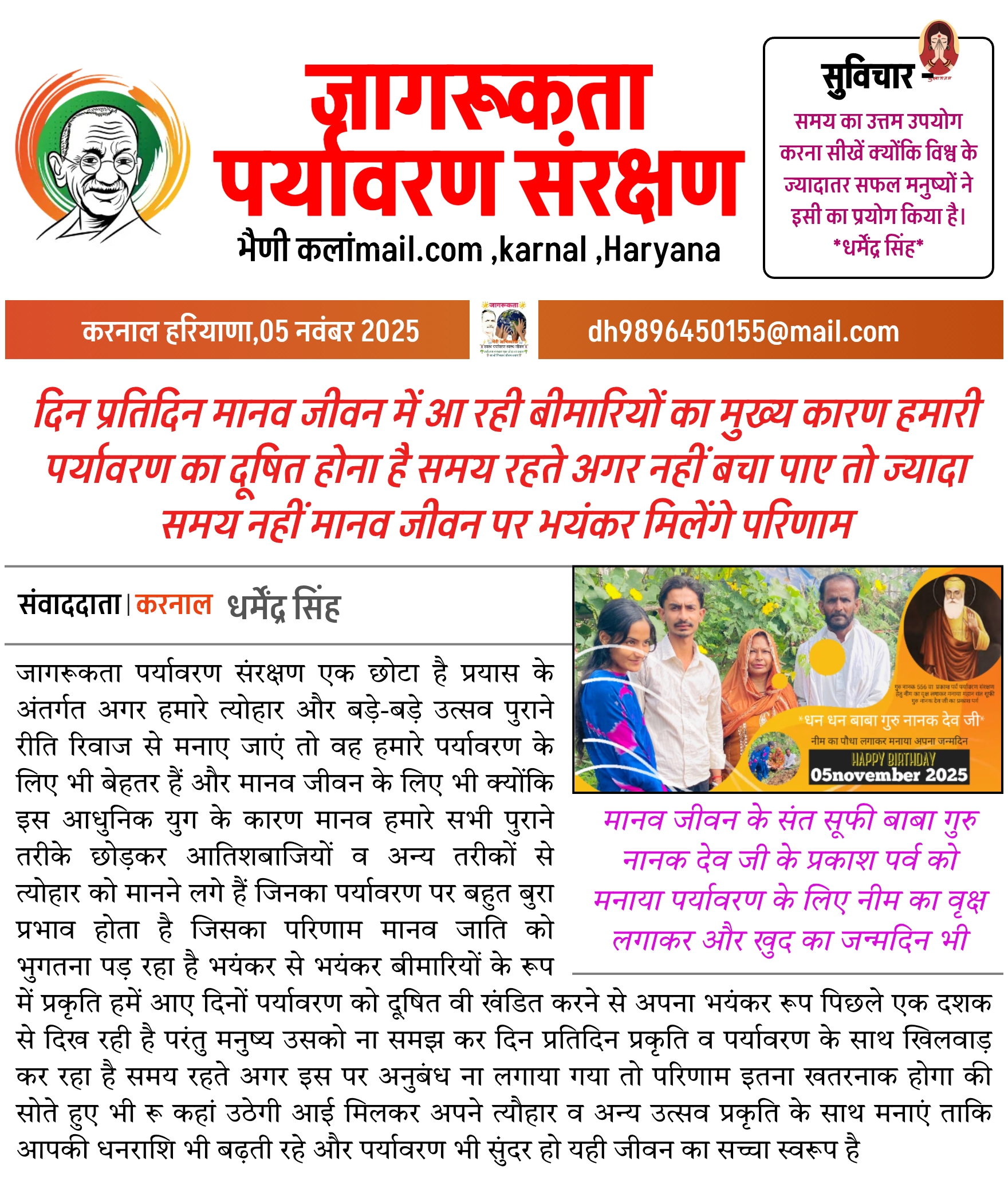 सभी पत्रकार भाइयों से निवेदन की हर त्यौहार पर एक पौधा जरूर लगाए ताकि हम प्रकृति का हमारे ऊपर किए गए उपकार का कुछ अंश उसको दे जैसे हमारे आसपास घूमती चिड़ियों की चहचहाट खत्म हो चुकी है कहीं मानव जीवन भी इसी तरह नष्ट न हो जाए