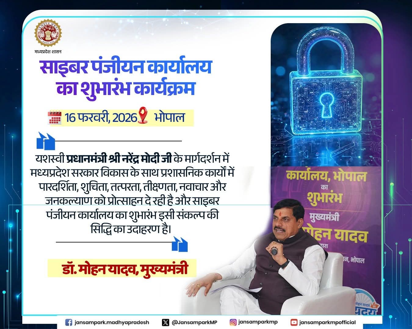 यशस्वी प्रधानमंत्री श्री नरेंद्र मोदी जी के मार्गदर्शन में मध्यप्रदेश सरकार विकास के साथ प्रशासनिक कार्यों में पारदर्शिता, शुचिता, तत्परता, तीक्ष्णता, नवाचार और जनकल्याण को प्रोत्साहन दे रही है और साइबर पंजीयन कार्यालय का शुभारंभ इसी संकल्प की सिद्धि का उदाहरण है।