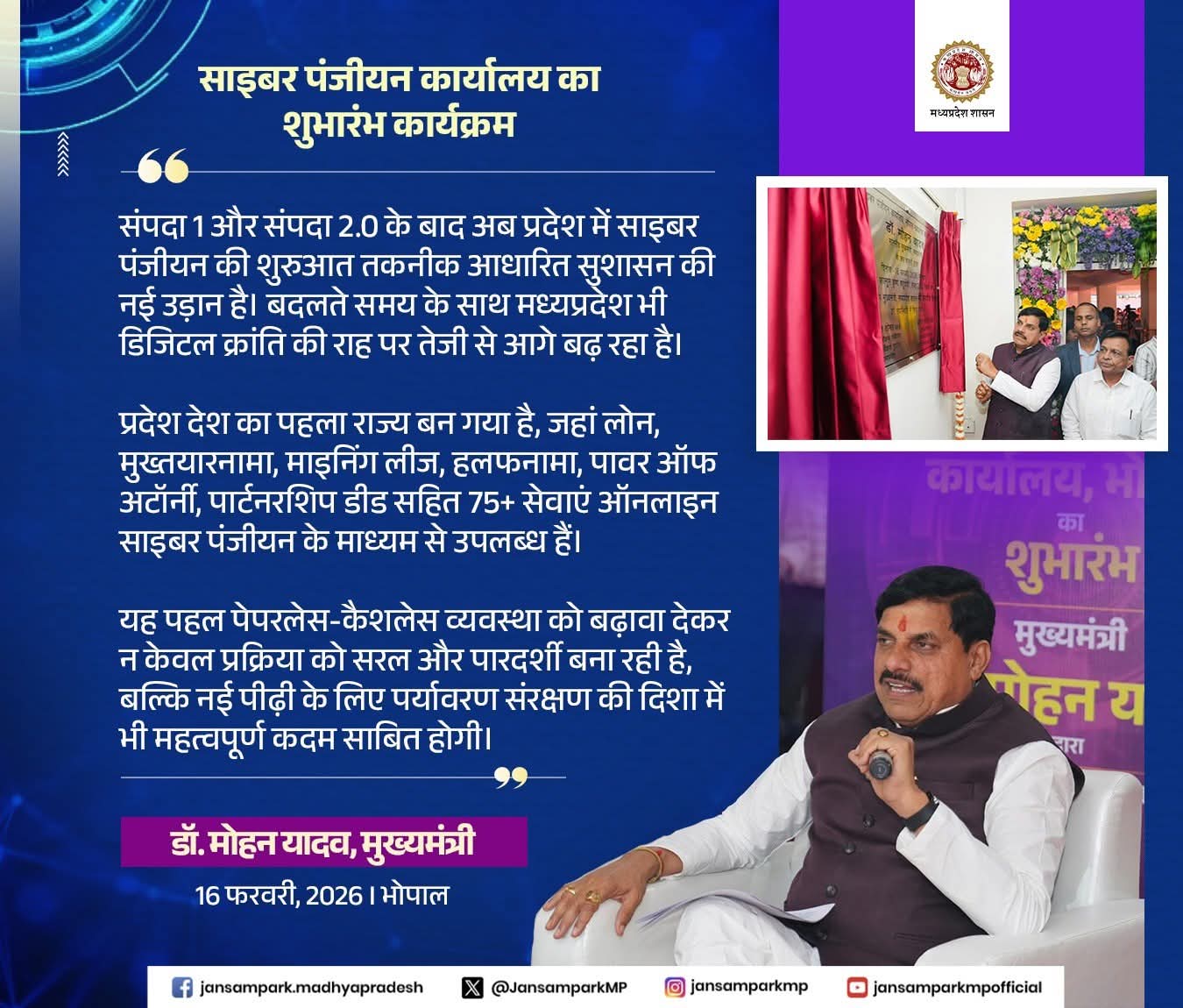 संपदा 1 और संपदा 2.0 के बाद अब प्रदेश में साइबर पंजीयन की शुरुआत तकनीक आधारित सुशासन की नई उड़ान है। बदलते समय के साथ मध्यप्रदेश भी डिजिटल क्रांति की राह पर तेजी से आगे बढ़ रहा है।
