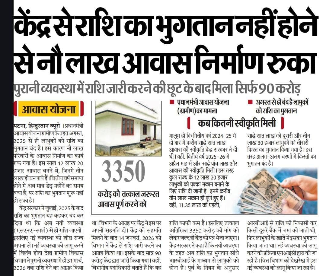 केंद्र से राशि का भुगतान नहीं होने से नौ लाख आवास निर्माण रुका