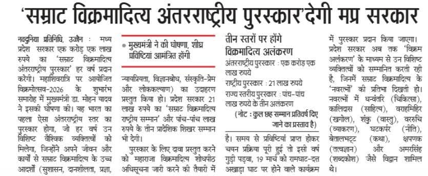 सम्राट विक्रमादित्य अंतरराष्ट्रीय पुरस्कार देगी मध्यप्रदेश सरकार