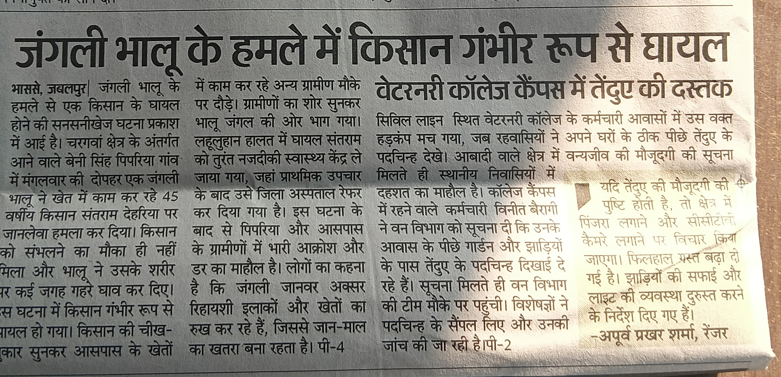 जंगली भालू के हमले में किसान गंभीर रूप से घायल