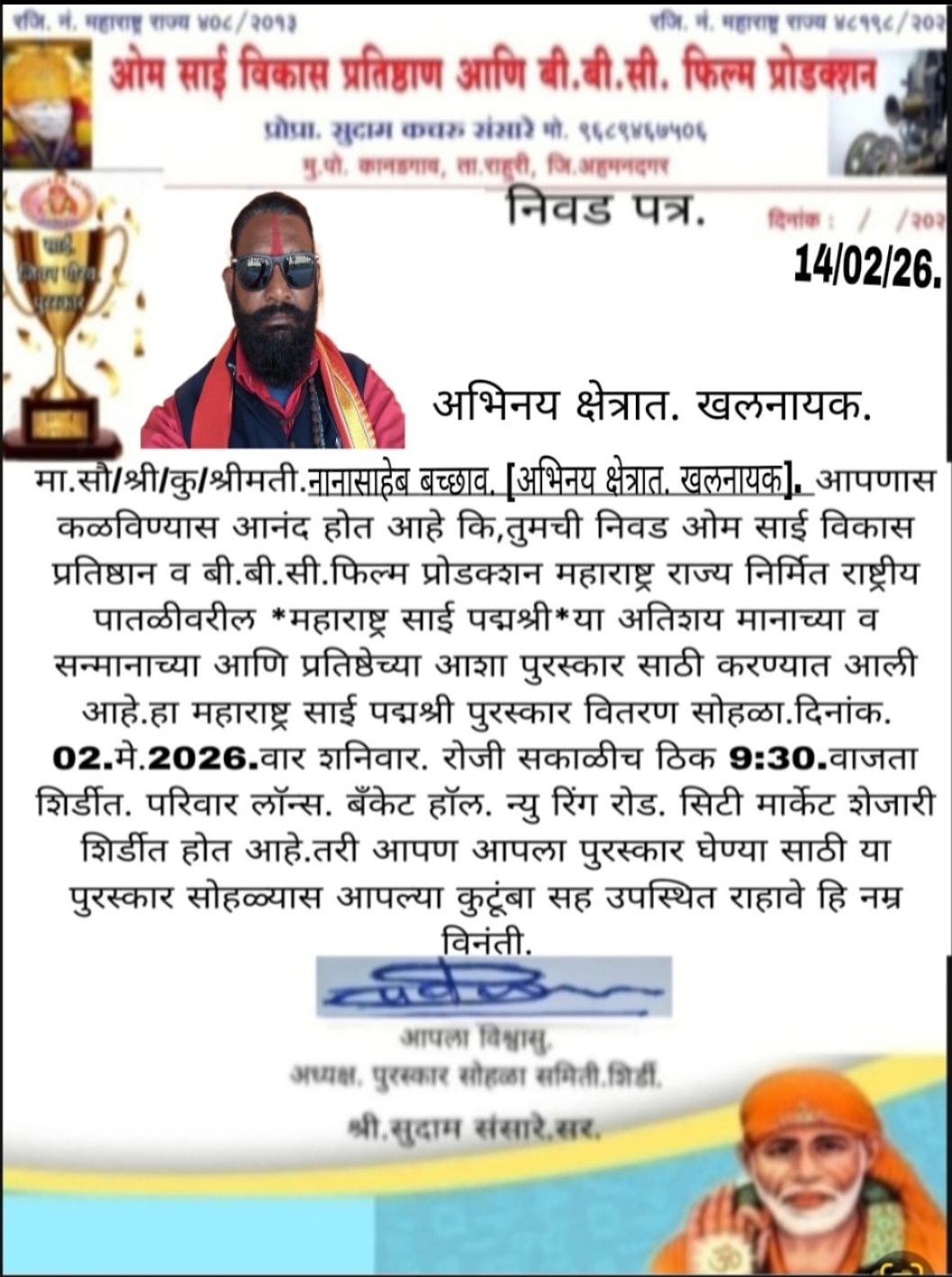 *शिर्डीत भव्य व दिव्य महाराष्ट्र साई पद्मश्री. पुरस्कार🏆 सोहळा*.श्री.सुदाम संसारे.सर. ओम साई विकास प्रतिष्ठान व बी.बी.सी.फिल्म प्रोडक्शन महाराष्ट्र राज्य निर्मित. *राष्ट्रीय पातळीवरील भारत देशातील पहिलाच साई च्या नावाने दिला जाणारा व साईच्या पावन व पवित्र भुमित शिर्डीत देत आहोत आसा *मानाचा,सन्मानाचा,प्रतिष्ठेचा व श्रद्धेचा महाराष्ट्र साई.पद्मश्री. पुरस्कार.🏆 २०२६*.हा दिनांक. *०२.मे..२०२६.वार शनिवारी ठिक सकाळीच १०. वाजता *शिर्डीत परिवार लाॅन्स,बॅंकेट हाॅल,न्यु रिंग रोड.सिटी मार्केट शेजारी इंडियन पेट्रोल पंपा पासुन जवळच* या🏆 पुरस्कार सोहळ्यास सुरुवात होणार आहे.आपण हा पुरस्कार वेगवेगळ्या ३६.प्रकारच्या क्षेत्रात उल्लेखनीय कार्य करत आहेत व केले आहे आशा मान्यवर व्यक्तिंना त्यांच्या कामाची पोहच पावती म्हणून हा यथोचित सन्मान व सत्कार देत आहोत.ते क्षेत्र.सिनेमा सृष्टीतील सावित्री कलयुगातली या मराठी चित्रपटाचे निर्माते व खलनायक अभिनेते कराटे मास्टर नानासाहेब बच्छाव यांची बेस्ट व्हीलन अवॉर्ड साठी निवड करण्यात आली.