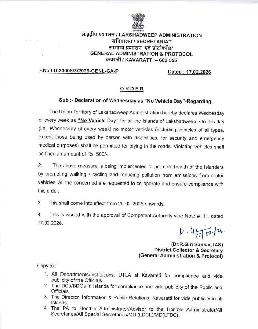 ലക്ഷദ്വീപ് ഭരണകൂടം ഓരോ ബുധനാഴ്ചയും “വാഹനരഹിത ദിവസം” ആയി പ്രഖ്യാപിച്ച പുതിയ ഉത്തരവ് (17-02-2026) ആരോഗ്യവും പരിസ്ഥിതിയും സംരക്ഷിക്കാനുള്ള ലക്ഷ്യത്തോടെ വന്നതാണെന്ന് അധികൃതർ വ്യക്തമാക്കുന്നു. നടക്കലും സൈക്കിളിംഗും പ്രോത്സാഹിപ്പിക്കുകയും മലിനീകരണം കുറയ്ക്കുകയും ചെയ്യുക എന്ന ആശയം കേൾക്കുമ്പോൾ ആകർഷകമാണ്. പക്ഷേ ദ്വീപുകളുടെ യാഥാർത്ഥ്യ ജീവിതക്രമത്തിൽ ഇത് പ്രായോഗികമാണോ എന്ന ചോദ്യമാണ് ഇപ്പോൾ ഉയരുന്നത്.