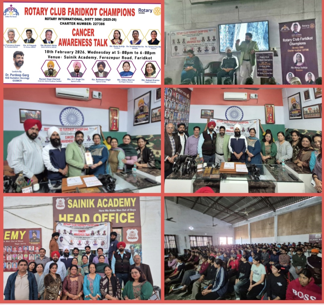 ਰੋਟਰੀ ਕਲੱਬ ਫਰੀਦਕੋਟ ਚੈਂਪੀਅਨ ਵੱਲੋਂ ਕੈਂਸਰ ਪ੍ਰਤੀ ਜਾਗਰੂਕ ਕਰਨ ਲਈ ਸੈਨਿਕ ਅਕੈਡਮੀ ਫਰੀਦਕੋਟ ਵਿਖੇ ਸੈਮੀਨਾਰ ਦਾ ਆਯੋਜਨ