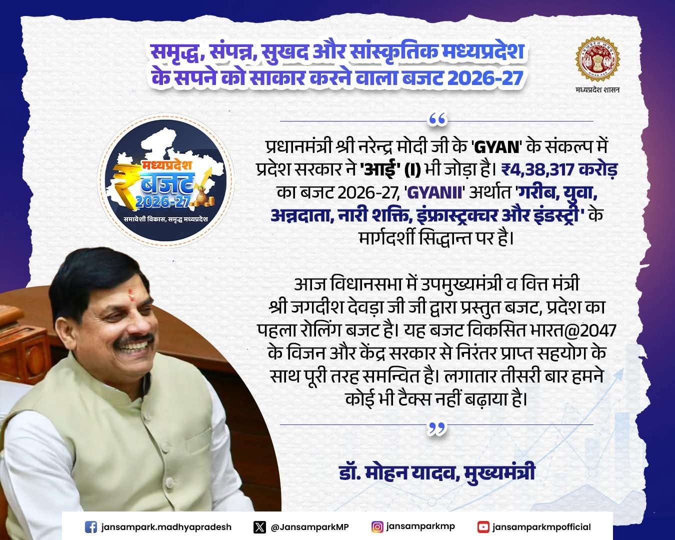 प्रधानमंत्री श्री नरेन्द्र मोदी जी के 'GYAN' के संकल्प में प्रदेश सरकार ने 'आई' (I) भी जोड़ा है। ₹4,38,317 करोड़ का बजट 2026-27, 'GYANII' अर्थात 'गरीब, युवा, अन्नदाता, नारी शक्ति, इंफ्रास्ट्रक्चर और इंडस्ट्री' के मार्गदर्शी सिद्धान्त पर है।