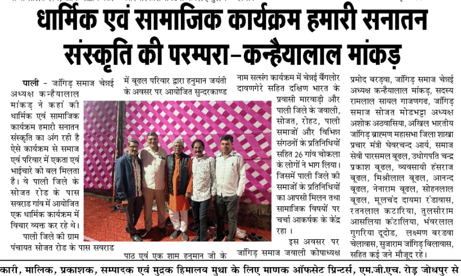 पाली - जांगिड़ समाज चेन्नई अध्यक्ष कन्हैयालाल मांकड़ ने कहां की धार्मिक एवं सामाजिक कार्यक्रम हमारी सनातन संस्कृति का अंग रही है ऐसे कार्यक्रम से समाज एवं परिवार में एकता एवं भाईचारे को बल मिलता है। वे पाली जिले के सोजत रोड के पास सवराड गांव में आयोजित एक धार्मिक कार्यक्रम में विचार व्यक्त कर रहे थे।
