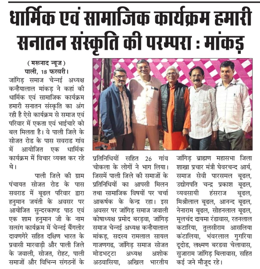 पाली जिले की ग्राम पंचायत सोजत रोड के पास सवराड में बूढल परिवार द्वारा हनुमान जयंती के अवसर पर आयोजित सुन्दरकाण्ड पाठ एवं एक शाम हनुमान जी के नाम सत्संग कार्यक्रम में चेन्नई बैंगलोर दावणगेरे सहित दक्षिण भारत के प्रवासी मारवाड़ी और पाली जिले के जवाली, सोजत, रोहट, पाली समाजों और विभिन्न संगठनों के प्रतिनिधियों सहित 26 गांव चोकला के लोगों ने भाग लिया। जिसमें पाली जिले की समाजों के प्रतिनिधियों का आपसी मिलन तथा सामाजिक विषयों पर चर्चा आकर्षक के केंद्र रहा ।