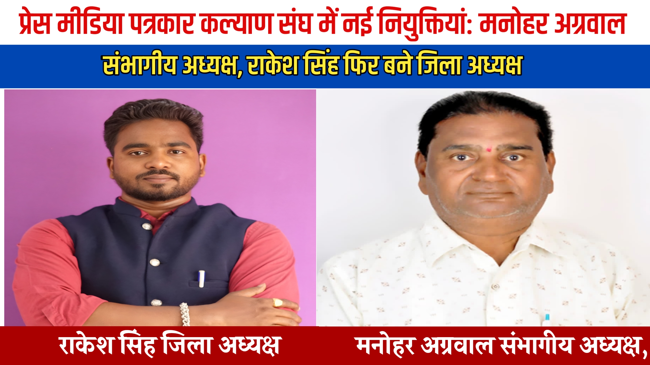 बैतूल। प्रेस मीडिया पत्रकार कल्याण संघ को मजबूती प्रदान करते हुए संगठन स्तर पर महत्वपूर्ण नियुक्तियां की गई हैं। संगठन के राष्ट्रीय अध्यक्ष रविंद्र सिंह पवैया द्वारा जारी आदेश के तहत वरिष्ठ पत्रकार मनोहर अग्रवाल को संभागीय अध्यक्ष तथा राकेश सिंह को पुनः दूसरी बार जिला अध्यक्ष नियुक्त किया गया है। इन नियुक्तियों से संगठन में उत्साह का माहौल है और पत्रकार हितों को लेकर नई ऊर्जा का संचार हुआ है। नव नियुक्त संभागीय अध्यक्ष मनोहर अग्रवाल लंबे समय से पत्रकारिता के क्षेत्र में सक्रिय रहे हैं। वे निष्पक्ष पत्रकारिता, संगठनात्मक एकता और पत्रकारों के अधिकारों के लिए सतत संघर्ष करते रहे हैं। उनके अनुभव और नेतृत्व क्षमता से संभाग स्तर पर संगठन को नई दिशा मिलने की उम्मीद जताई जा रही है। वहीं, राकेश सिंह का जिला अध्यक्ष पद पर दोबारा चयन संगठन के प्रति उनके समर्पण, कार्यकुशलता और पूर्व कार्यकाल में किए गए उल्लेखनीय प्रयासों का प्रमाण माना जा रहा है। उनके नेतृत्व में जिले में पत्रकारों की समस्याओं के समाधान, सुरक्षा और सम्मान के लिए कई प्रभावी कदम उठाए गए हैं।