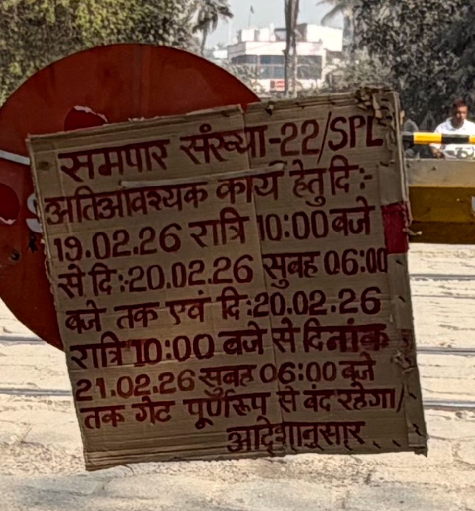 दोनों रेल पटरी पर सड़क मरम्मत कार्य के मद्देनजर समपार संख्या–22/SPL को निर्धारित तिथियों में रात्रि के समय पूर्ण रूप से बंद रखने का आदेश जारी किया गया है। प्रशासन द्वारा जारी सूचना के अनुसार 19 फरवरी 2026 की रात 10:00 बजे से 20 फरवरी 2026 की सुबह 06:00 बजे तक तथा पुनः 20 फरवरी 2026 की रात 10:00 बजे से 21 फरवरी 2026 की सुबह 06:00 बजे तक गेट पूरी तरह बंद रहेगा।