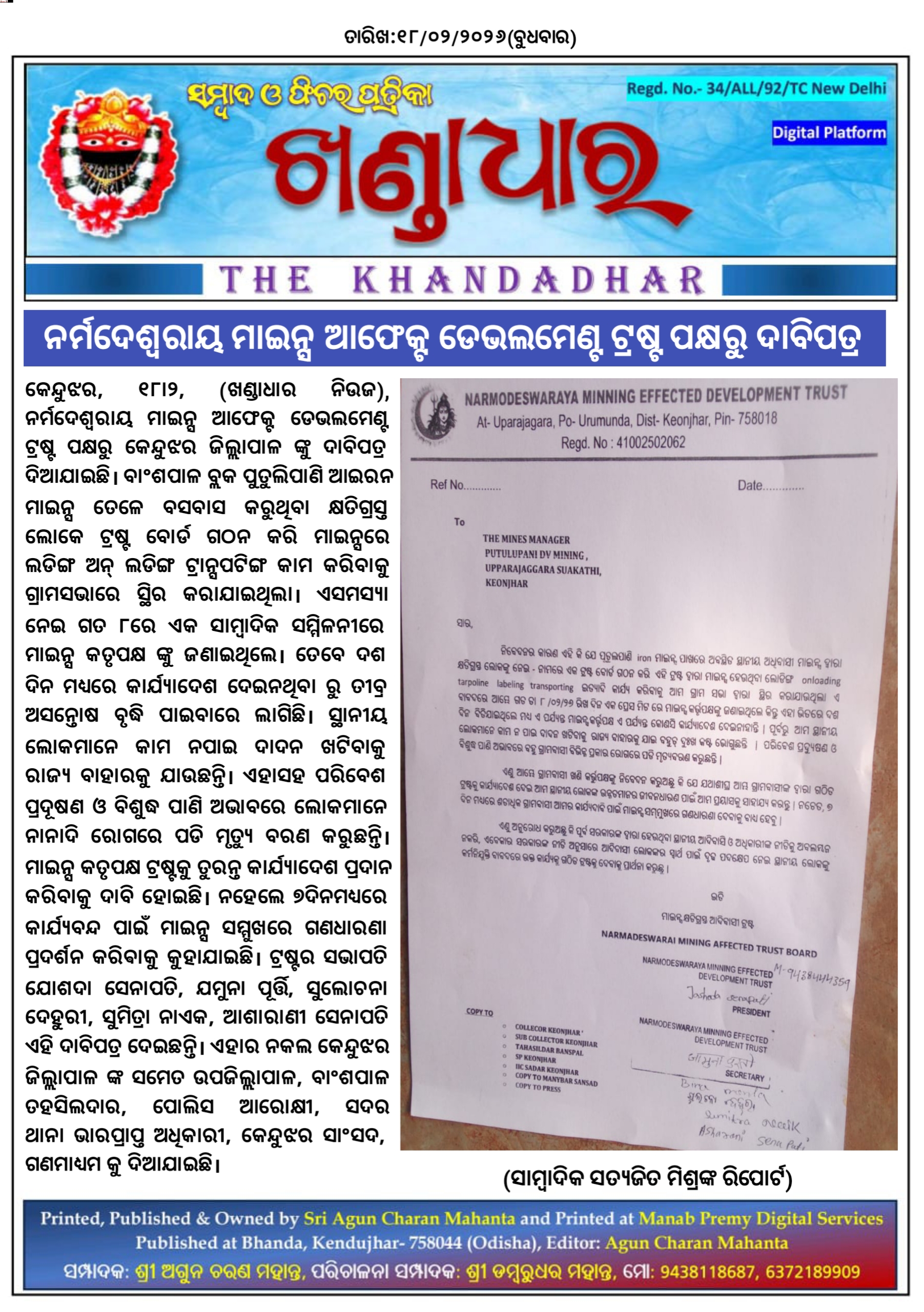 ନର୍ମଦେଶ୍ଵରାୟ ମାଇନ୍ସ ଆଫେକ୍ଟ ଡେଭଲମେଣ୍ଟ ଟ୍ରଷ୍ଟ ପକ୍ଷରୁ ଦାବିପତ୍ର।