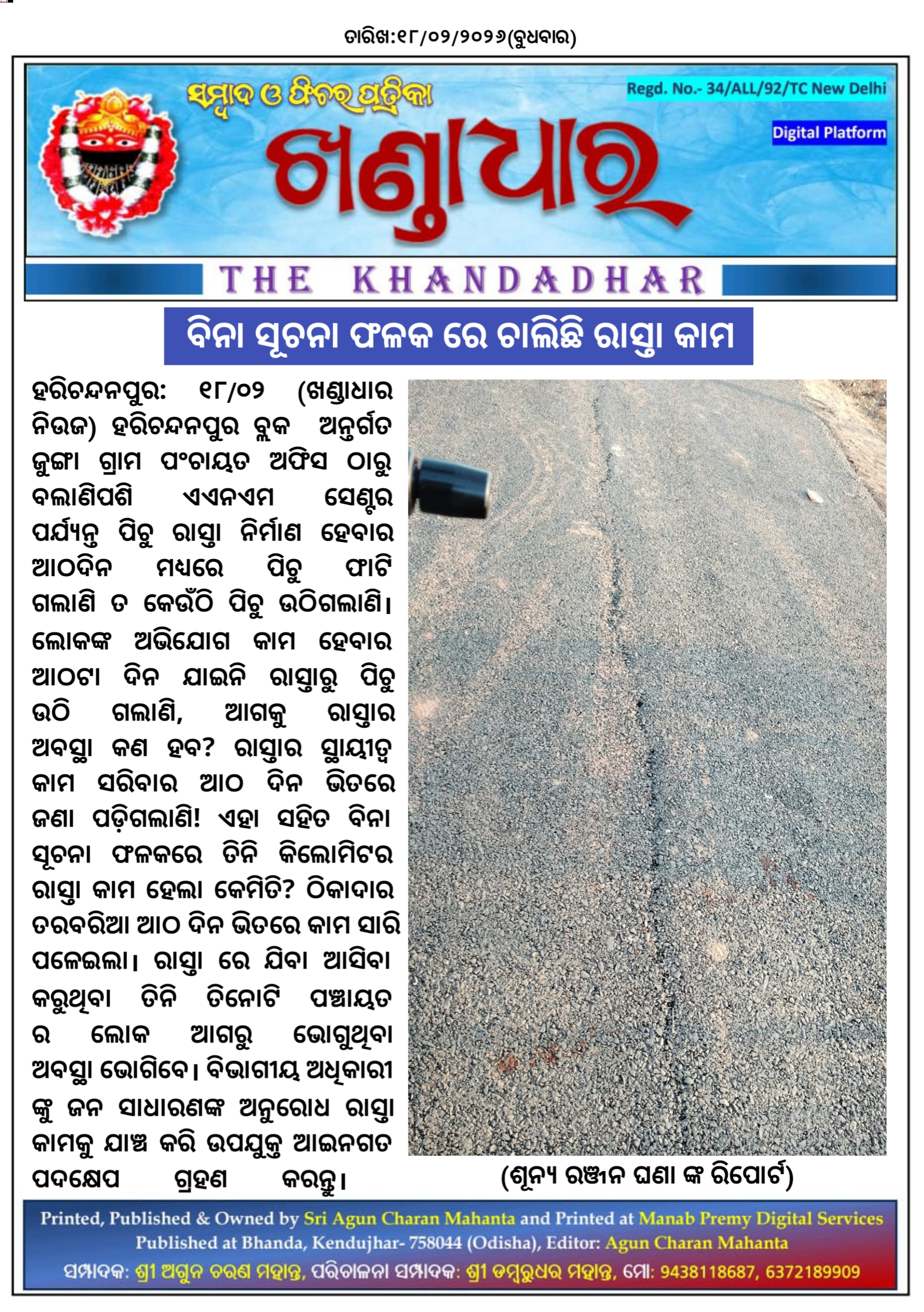 ହରିଚନ୍ଦନପୁର: ୧୮/୦୨, ହରିଚନ୍ଦନପୁର ବ୍ଲକ ଅନ୍ତର୍ଗତ ଯୁଙ୍ଗା ଗ୍ରାମ ପଂଚାୟତ ଅଫିସ ଠାରୁ ବଲାଣିପଶି ଏଏନଏମ ସେଣ୍ଟର ପର୍ଯ୍ୟନ୍ତ ପିଚୁ ରାସ୍ତା ନିର୍ମାଣ ହେବାର ଆଠଦିନ ମଧ୍ୟରେ ପିଚୁ ଫାଟି ଗଲାଣି ତ କେଉଁଠି ପିଚୁ ଉଠିଗଲାଣି । ଲୋକଙ୍କ ଅଭିଯୋଗ କାମ ହେବାର ଆଠଟା ଦିନ ଯାଇନି ରାସ୍ତା ଉଠି ଗଲାଣି, ଆଗକୁ ରାସ୍ତାର ଅବସ୍ଥା କଣ ହବ? ରାସ୍ତାର ସ୍ଥାୟୀତ୍ବ କାମ ସରିବାର ଆଠ ଦିନ ଭିତରେ ଜଣା ପଡ଼ିଗଲାଣି। ଏହା ସହିତ ବିନା ସୂଚନା ଫଳକରେ ତିନି କିଲୋମିଟର ରାସ୍ତା କାମ ହେଲା କେମିତି? ଠିକାଦାର ତରବରିଆ ଆଠ ଦିନ ଭିତରେ କାମ ସାରି ପଳେଇଲା। ରାସ୍ତା ରେ ଯିବା ଆସିବା କରୁଥିବା ତିନି ତିନୋଟି ପଞ୍ଚାୟତ ର ଲୋକ ଆଗରୁ ଭୋଗୁଥିବା ଅବସ୍ଥା ଭୋଗିବେ। ବିଭାଗୀୟ ଅଧିକାରୀ ଙ୍କୁ ଜନ ସାଧାରଣଙ୍କ ଅନୁରୋଧ ରାସ୍ତା କାମକୁ ଯାଞ୍ଚ କରି ଉପଯୁକ୍ତ ପଦକ୍ଷେପ ଗ୍ରହଣ କରନ୍ତୁ।