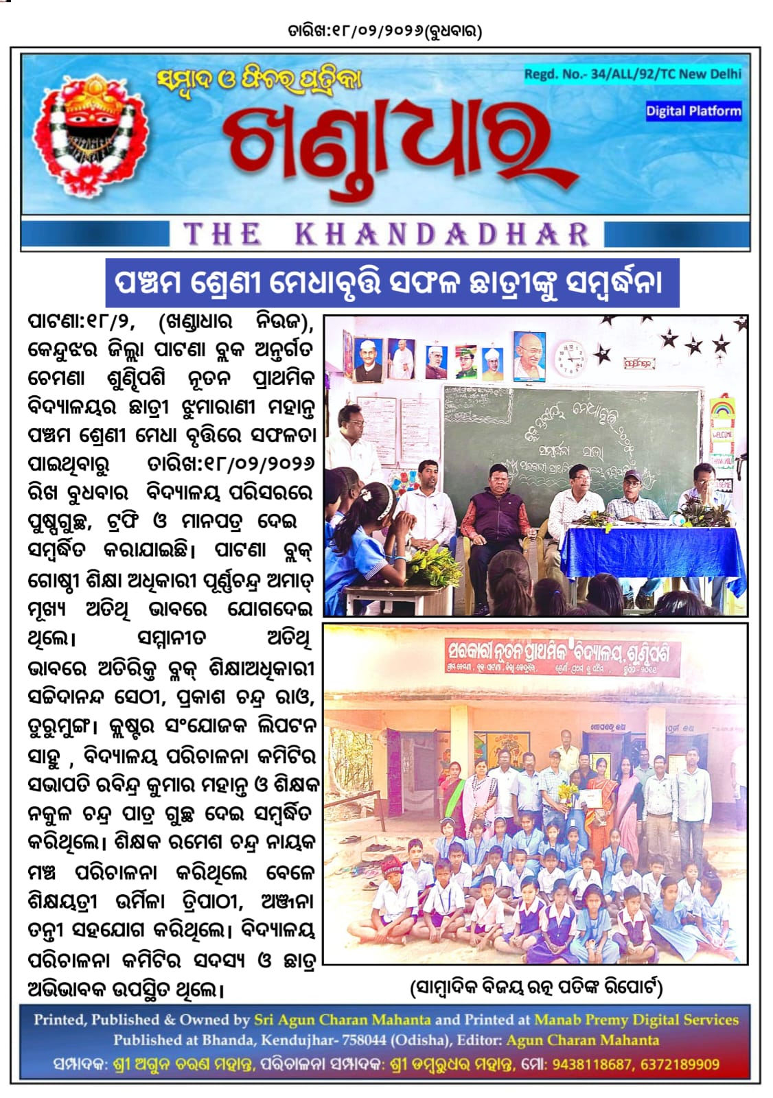 ପାଟଣା :୧୮/୨, କେନ୍ଦୁଝର ଜିଲ୍ଲା ପାଟଣା ବ୍ଲକ ଅନ୍ତର୍ଗତ ଚେମଣା ଶୁଣ୍ଢିପଶି ନୂତନ ପ୍ରାଥମିକ ବିଦ୍ୟାଳୟର ଛାତ୍ରୀ ଝୁମାରାଣୀ ମହାନ୍ତ ପଞ୍ଚମ ଶ୍ରେଣୀ ମେଧା ବୃତ୍ତିରେ ସଫଳତା ପାଇଥିବାରୁ ତାରିଖ ୧୮/୦୨/୨୦୨୬ ରିଖ ବୁଧବାର ବିଦ୍ୟାଳୟ ପରିସରରେ ପୁଷ୍ପଗୁଚ୍ଛ, ଟ୍ରଫି ଓ ମାନପତ୍ର ଦେଇ ସମ୍ବର୍ଦ୍ଧିତ କରାଯାଇଛି । ପାଟଣା ବ୍ଲକ୍ ଗୋଷ୍ଠୀ ଶିକ୍ଷା ଅଧିକାରୀ ପୂର୍ଣ୍ଣଚନ୍ଦ୍ର ଅମାତ୍ ମୂଖ୍ୟ ଅତିଥି ଭାବରେ ଯୋଗଦେଇ ଥିଲେ। ସମ୍ମାନୀତ ଅତିଥି ଭାବରେ ଅତିରିକ୍ତ ବ୍ଳକ୍ ଶିକ୍ଷାଅଧିକାରୀ ସଚ୍ଚିଦାନନ୍ଦ ସେଠୀ, ପ୍ରକାଶ ଚନ୍ଦ୍ର ରାଓ, ତୁରୁମୁଙ୍ଗ। କ୍ଲଷ୍ଟର ସଂଯୋଜକ ଲିପଟନ ସାହୁ , ବିଦ୍ୟାଳୟ ପରିଚାଳନା କମିଟିର ସଭାପତି ରବିନ୍ଦ୍ର କୁମାର ମହାନ୍ତ ଓ ଶିକ୍ଷକ ନକୁଳ ଚନ୍ଦ୍ର ପାତ୍ର ଗୁଚ୍ଛ ଦେଇ ସମ୍ବର୍ଦ୍ଧିତ କରିଥିଲେ। ଶିକ୍ଷକ ରମେଶ ଚନ୍ଦ୍ର ନାୟକ ମଞ୍ଚ ପରିଚାଳନା କରିଥିଲେ ବେଳେ ଶିକ୍ଷୟତ୍ରୀ ଉର୍ମିଳା ତ୍ରିପାଠୀ, ଅଞ୍ଜନା ତନ୍ତୀ ସହଯୋଗ କରିଥିଲେ । ବିଦ୍ୟାଳୟ ପରିଚାଳନା କମିଟିର ସଦସ୍ୟ ଓ ଛାତ୍ର ଅଭିଭାବକ ଉପସ୍ଥିତ ଥିଲେ ।