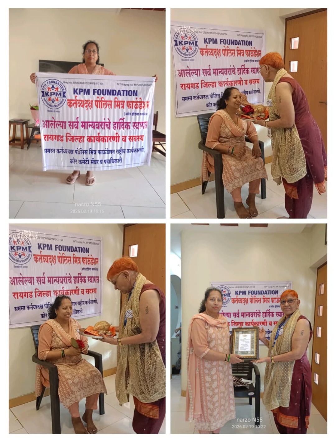 महाराष्ट्र राज्यांचे आराध्य दैवत छत्रपती शिवाजी महाराज यांच्या जयंतीनिमित्त विनम्र अभिवादन. आजच्या दिवसाचं औचित्य साधून कर्तव्य दक्ष पोलिस मित्र फाउंडेशन नाशिक तर्फे चेंढरे अलिबाग रायगड जिल्ह्यातील महाराष्ट्र च्या सौ. प्रियदर्शनी संजय पाटील पंचायत समिती चेंढरे मधून प्रचंड मतांनी निवडून आल्या बद्दल श्री फळ ,शाल, गुलाब पुष्प गुच्छ व आपल्या भारत देशाचे संविधान फ्रेम देऊन सन्मानित करण्यात आले. याच दरम्यान रायगड जिल्हा चा बेनर चे मा. पाटील मेडम च्या हस्ते उद्घाटन करण्यात आले. ही संपूर्ण जबाबदारी