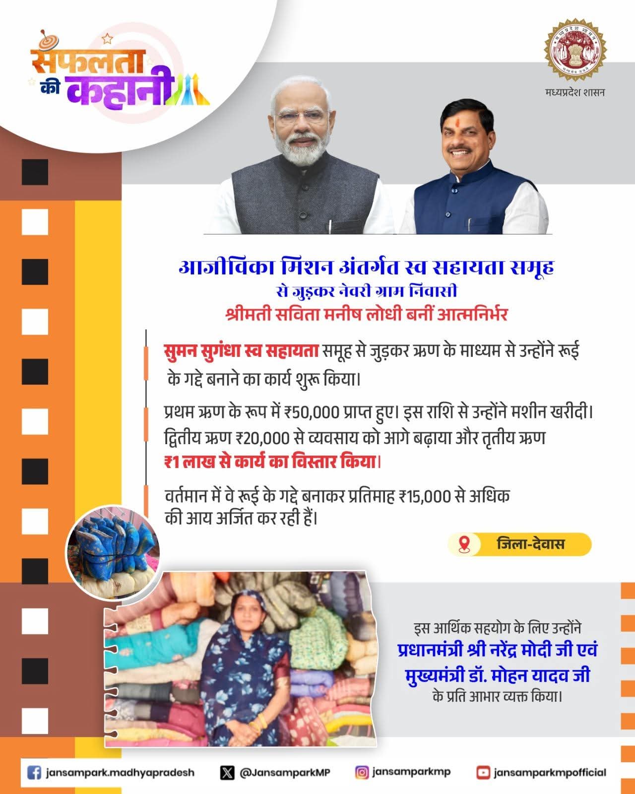 आजीविका मिशन अंतर्गत स्व-सहायता समूह से जुड़कर देवास जिले के नेवरी ग्राम निवासी श्रीमती सविता मनीष लोधी बनीं आत्मनिर्भर