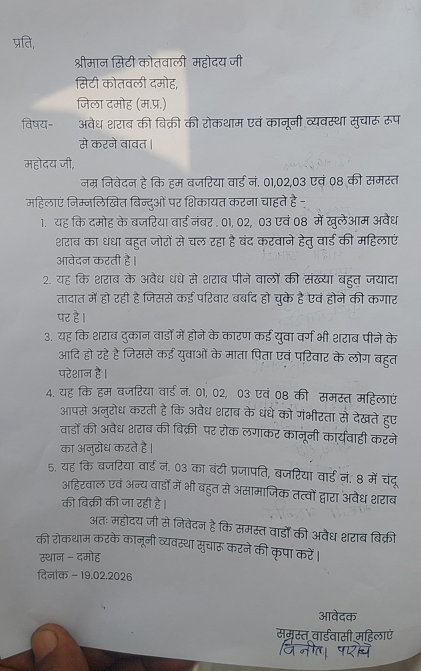 बजरिया वार्ड नंबर 1,2,3 एवं 8 की समस्त महिलाओं ने कोतवाली जाकर ज्ञापन सोपा जहां महिलाओं ने बताया कि बजरिया वार्ड में अवैध शराब का कारोबार लगातार बढ़ता जा रहा है जिससे युवा पीढ़ी नशे की चपेट में आ रही है शराब के कारण आए दिन लड़ाई झगड़ा हो रहे हैं एवं युवा पीढ़ी भटक रही है महिलाओं ने कहा कि घर से निकलने में भी परेशानियां आती हैं लोग गाली गलौज करते हैं बच्चों के एग्जाम चल रहे हैं इससे भी बच्चों को परेशानी आ रही है शराब पीकर घर में आकर गाली गलोज करना लड़ाई झगड़ा करना एवं बाहर लोग लड़ाई झगड़ा करते हैं तो बच्चे पढ़ नहीं पा रहे हैं इसी से परेशान होकर महिला कोतवाली थाना पहुंची और समस्त वार्ड की अवैध शराब बंद करने को लेकर ज्ञापन सोपा थाना प्रभारी जी से निवेदन किया की समस्त वार्डों की अवैध शराब जल्द से जल्द बंद कराया जाए जिसमें भगवती मानव कल्याण शक्ति जिला अध्यक्ष मुकेश तोमर एवं भगवती मारो कल्याण संगठन की चढ़ते चित्रा राजपूत एवं समस्त कार्यकर्ताओं की उपस्थिति रही