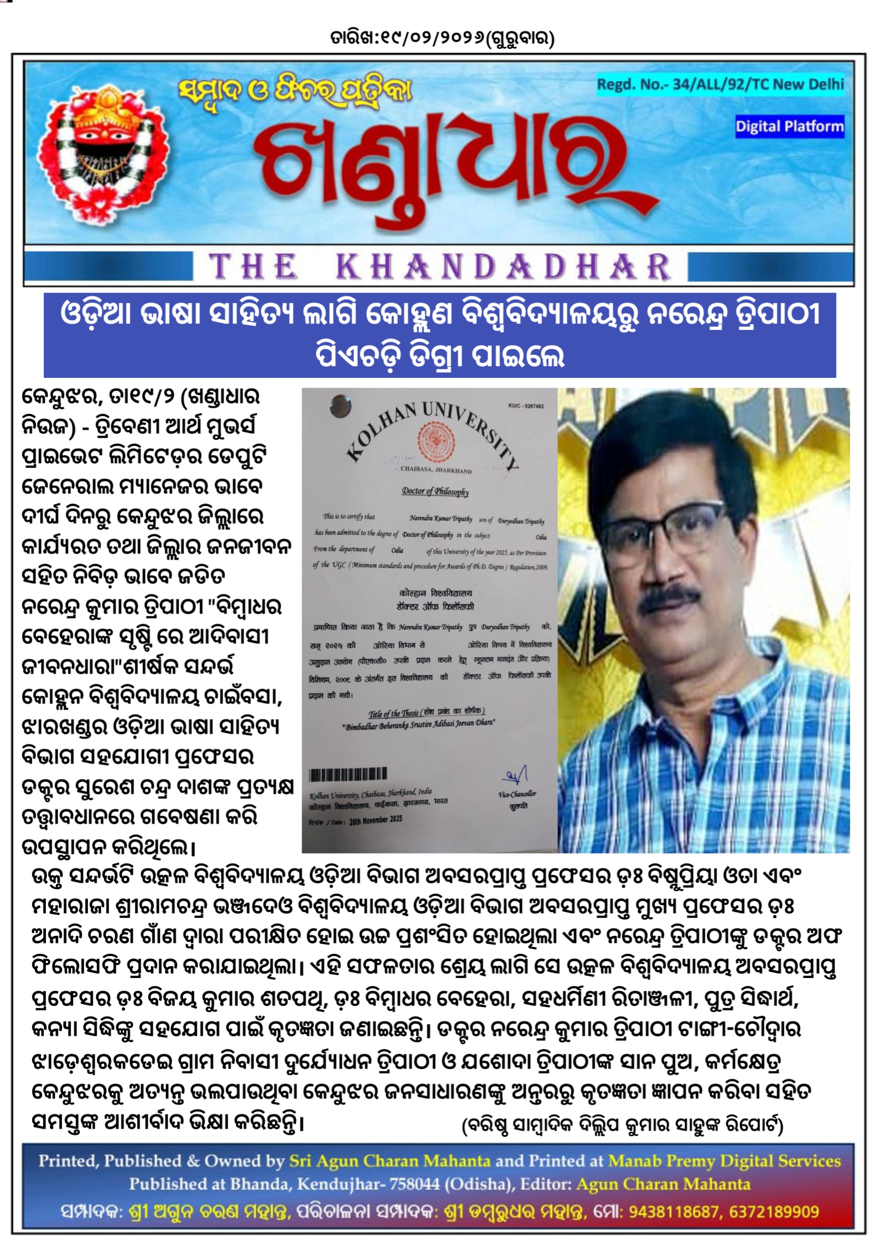 ଓଡ଼ିଆ ଭାଷା ସାହିତ୍ୟ ଲାଗି କୋହ୍ଲଣ ବିଶ୍ୱବିଦ୍ୟାଳୟରୁ ନରେନ୍ଦ୍ର ତ୍ରିପାଠୀ ପିଏଚଡ଼ି ଡିଗ୍ରୀ ପାଇଲେ।