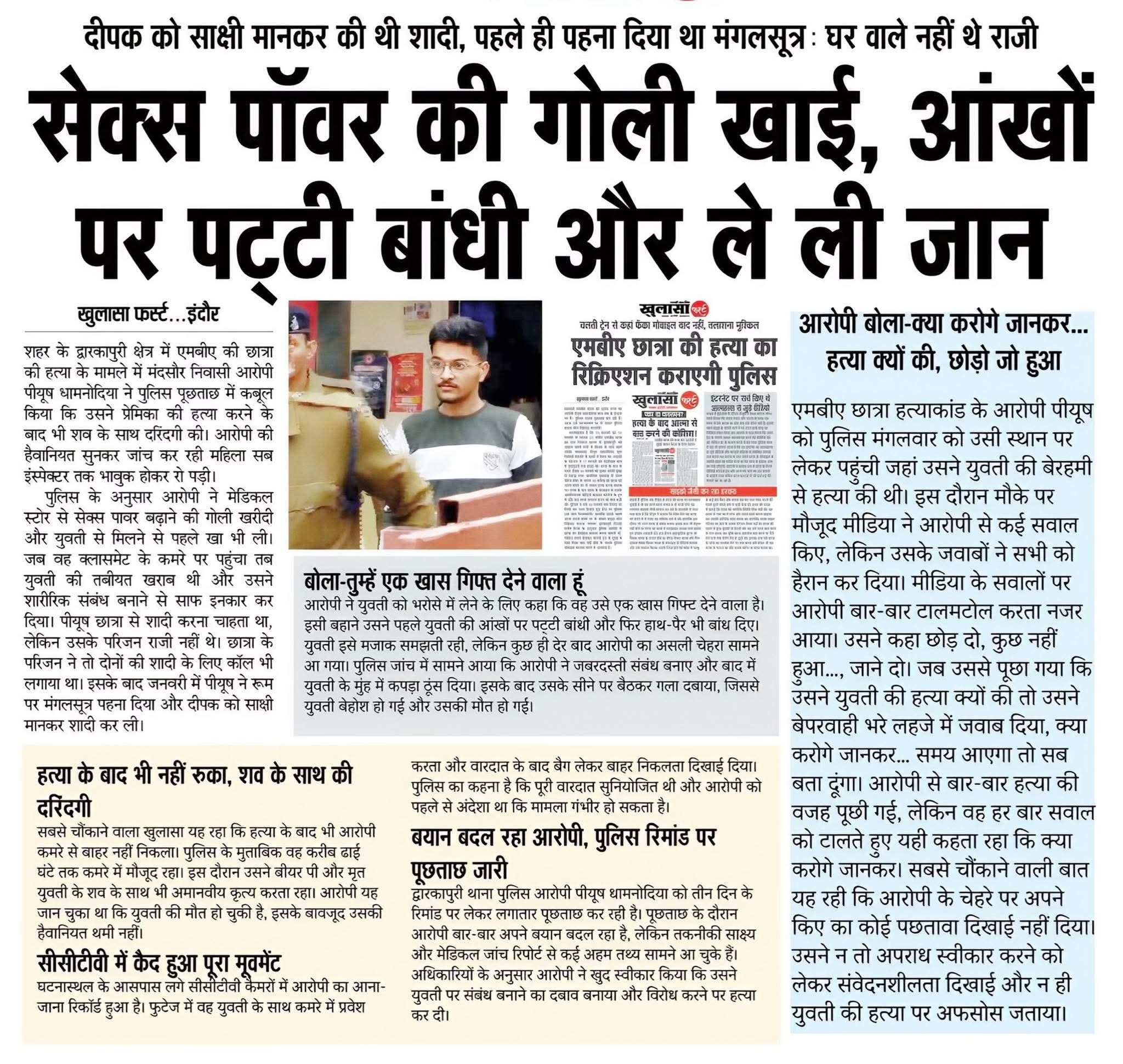 рдпрд╣ рдЦрдмрд░ рдЗрдВрджреМрд░ рдХреА рд╣реИ, рдЬрд╣рд╛рдБ рдПрдХ 21 рд╡рд░реНрд╖реАрдп MBA рдЫрд╛рддреНрд░рд╛ рдХреА рдЙрд╕рдХреЗ рд╣реА рдкрд░рд┐рдЪрд┐рдд рдпреБрд╡рдХ рдиреЗ рдмреЗрд░рд╣рдореА рд╕реЗ рд╣рддреНрдпрд╛ рдХрд░ рджреАред рдЖрд░реЛрдк рд╣реИ рдХрд┐ рдпреБрд╡рдХ рдиреЗ рдкрд╣рд▓реЗ рдпреБрд╡рддреА рдХреЛ рд╢рд╛рджреА рдХрд╛ рднрд░реЛрд╕рд╛ рджрд┐рдпрд╛, рдЙрд╕реЗ тАЬрдЦрд╛рд╕ рдЧрд┐рдлреНрдЯтАЭ рджреЗрдиреЗ рдХреЗ рдмрд╣рд╛рдиреЗ рдмреБрд▓рд╛рдпрд╛, рдлрд┐рд░ рдЙрд╕рдХреА рдЖрдБрдЦреЛрдВ рдкрд░ рдкрдЯреНрдЯреА рдмрд╛рдВрдзреА рдФрд░ рдЧреЛрд▓реА рдорд╛рд░ рджреАред рдЗрддрдирд╛ рд╣реА рдирд╣реАрдВ, рд╣рддреНрдпрд╛ рдХреЗ рдмрд╛рдж рднреА рд╡рд╣ рдХрдорд░реЗ рдореЗрдВ рд░реБрдХрд╛ рд░рд╣рд╛ред рдкреБрд▓рд┐рд╕ рдЬрд╛рдВрдЪ рдореЗрдВ рд╕рд╛рдордиреЗ рдЖрдпрд╛ рдХрд┐ рдЖрд░реЛрдкреА рдиреЗ рдореЗрдбрд┐рдХрд▓ рд╕реНрдЯреЛрд░ рд╕реЗ рдкрд╣рд▓реЗ рд╣реА рдЧреЛрд▓реА рдЦрд░реАрджреА рдереА рдФрд░ рдкреВрд░реА рд╡рд╛рд░рджрд╛рдд рдХреА рд╕рд╛рдЬрд┐рд╢ рд░рдЪреА рдереАред