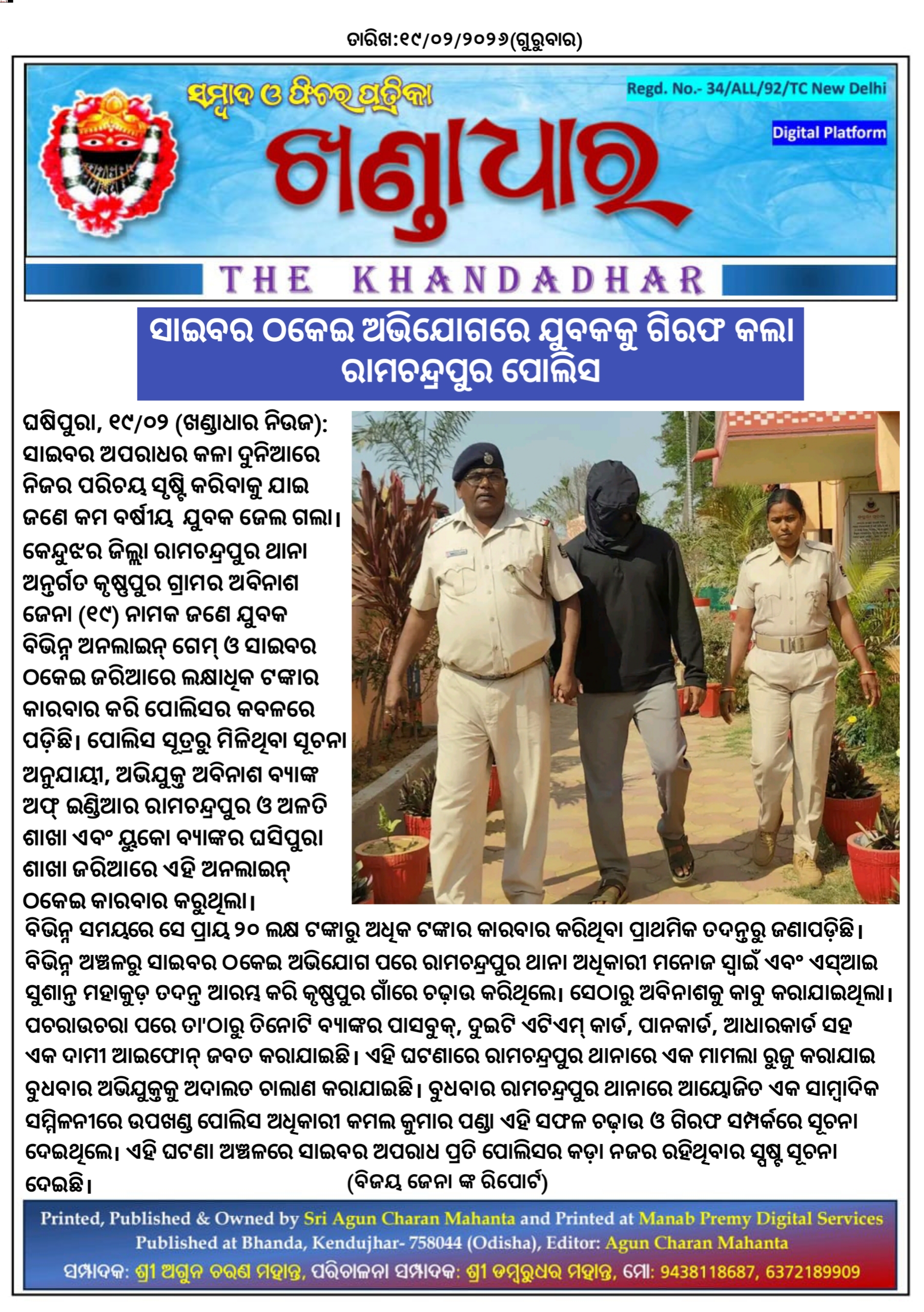 ଘଷିପୁରା,୧୯/୦୨ : ସାଇବର ଅପରାଧର କଳା ଦୁନିଆରେ ନିଜର ପରିଚୟ ସୃଷ୍ଟି କରିବାକୁ ଯାଇ ଜଣେ କମ ବର୍ଷୀୟ ଯୁବକ ଜେଲ ଗଲା । କେନ୍ଦୁଝର ଜିଲ୍ଲା ରାମଚନ୍ଦ୍ରପୁର ଥାନା ଅନ୍ତର୍ଗତ କୃଷ୍ଣପୁର ଗ୍ରାମର ଅବିନାଶ ଜେନା (୧୯) ନାମକ ଜଣେ ଯୁବକ ବିଭିନ୍ନ ଅନଲାଇନ୍ ଗେମ୍ ଓ ସାଇବର ଠକେଇ ଜରିଆରେ ଲକ୍ଷାଧିକ ଟଙ୍କାର କାରବାର କରି ପୋଲିସର କବଳରେ ପଡ଼ିଛି।ପୋଲିସ ସୂତ୍ରରୁ ମିଳିଥିବା ସୂଚନା ଅନୁଯାୟୀ, ଅଭିଯୁକ୍ତ ଅବିନାଶ ବ୍ୟାଙ୍କ ଅଫ୍ ଇଣ୍ଡିଆର ରାମଚନ୍ଦ୍ରପୁର ଓ ଅଳତି ଶାଖା ଏବଂ ୟୁକୋ ବ୍ୟାଙ୍କର ଘସିପୁରା ଶାଖା ଜରିଆରେ ଏହି ଅନଲାଇନ୍ ଠକେଇ କାରବାର କରୁଥିଲା। ବିଭିନ୍ନ ସମୟରେ ସେ ପ୍ରାୟ ୨୦ ଲକ୍ଷ ଟଙ୍କାରୁ ଅଧିକ ଟଙ୍କାର କାରବାର କରିଥିବା ପ୍ରାଥମିକ ତଦନ୍ତରୁ ଜଣାପଡ଼ିଛି।ବିଭିନ୍ନ ଅଞ୍ଚଳରୁ ସାଇବର ଠକେଇ ଅଭିଯୋଗ ପରେ ରାମଚନ୍ଦ୍ରପୁର ଥାନା ଅଧିକାରୀ ମନୋଜ ସ୍ଵାଇଁ ଏବଂ ଏସ୍ଆଇ ସୁଶାନ୍ତ ମହାକୁଡ଼ ତଦନ୍ତ ଆରମ୍ଭ କରି କୃଷ୍ଣପୁର ଗାଁରେ ଚଢ଼ାଉ କରିଥିଲେ। ସେଠାରୁ ଅବିନାଶକୁ କାବୁ କରାଯାଇଥିଲା। ପଚରାଉଚରା ପରେ ତା'ଠାରୁ ତିନୋଟି ବ୍ୟାଙ୍କର ପାସବୁକ୍, ଦୁଇଟି ଏଟିଏମ୍ କାର୍ଡ, ପାନକାର୍ଡ, ଆଧାରକାର୍ଡ ସହ ଏକ ଦାମୀ ଆଇଫୋନ୍ ଜବତ କରାଯାଇଛି।ଏହି ଘଟଣାରେ ରାମଚନ୍ଦ୍ରପୁର ଥାନାରେ ଏକ ମାମଲା ରୁଜୁ କରାଯାଇ ବୁଧବାର ଅଭିଯୁକ୍ତକୁ ଅଦାଲତ ଚାଲାଣ କରାଯାଇଛି। ବୁଧବାର ରାମଚନ୍ଦ୍ରପୁର ଥାନାରେ ଆୟୋଜିତ ଏକ ସାମ୍ବାଦିକ ସମ୍ମିଳନୀରେ ଉପଖଣ୍ଡ ପୋଲିସ ଅଧିକାରୀ କମଲ କୁମାର ପଣ୍ଡା ଏହି ସଫଳ ଚଢ଼ାଉ ଓ ଗିରଫ ସମ୍ପର୍କରେ ସୂଚନା ଦେଇଥିଲେ। ଏହି ଘଟଣା ଅଞ୍ଚଳରେ ସାଇବର ଅପରାଧ ପ୍ରତି ପୋଲିସର କଡ଼ା ନଜର ରହିଥିବାର ସ୍ପଷ୍ଟ ସୂଚନା ଦେଇଛି।