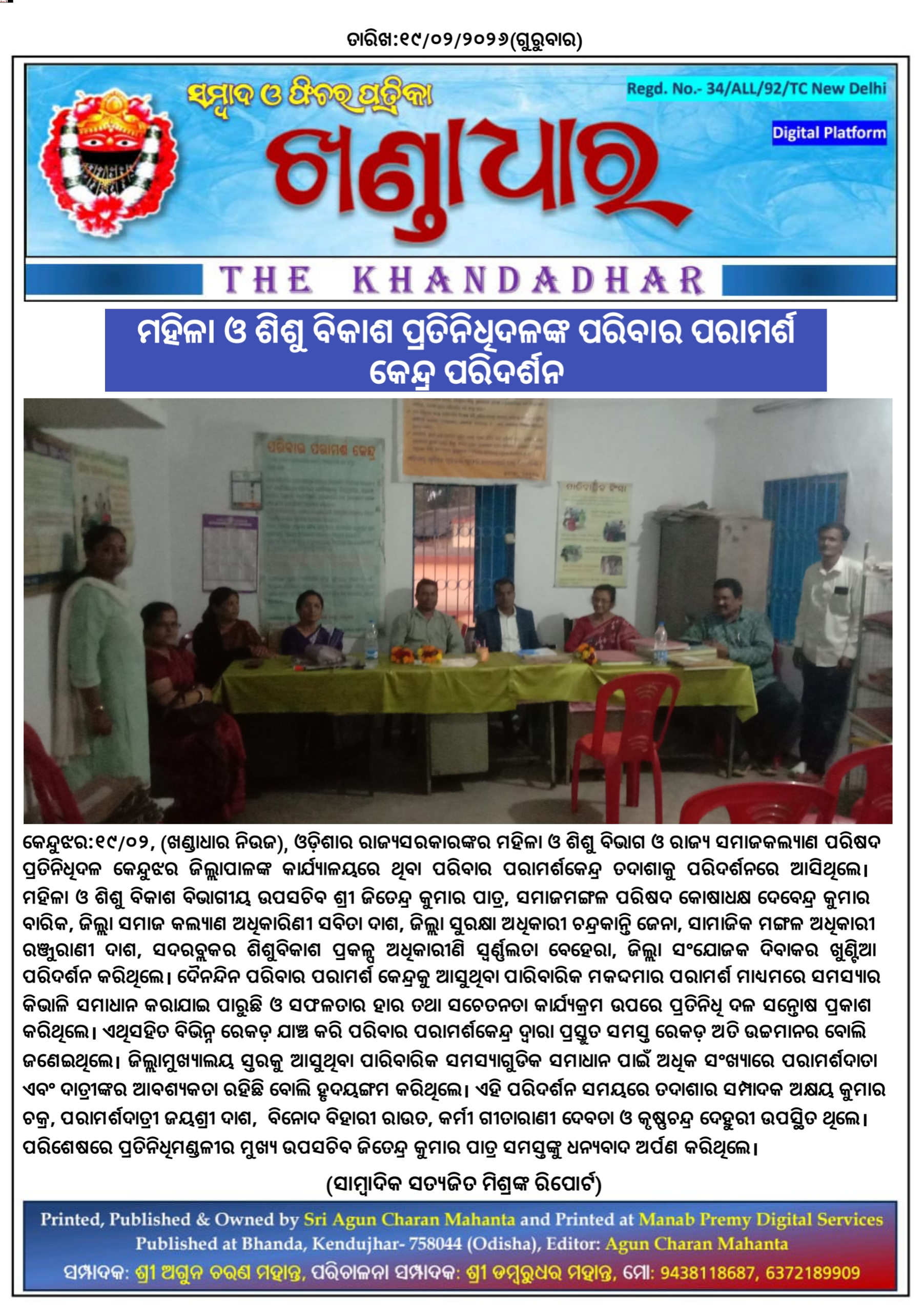 ଓଡ଼ିଶାର ରାଜ୍ୟସରକାରଙ୍କର ମହିଳା ଓ ଶିଶୁ ବିଭାଗ ଓ ରାଜ୍ୟ ସମାଜକଲ୍ୟାଣ ପରିଷଦ ପ୍ରତିନିଧିଦଳ କେନ୍ଦୁଝର ଜିଲ୍ଲାପାଳଙ୍କ କାର୍ଯ୍ୟାଳୟରେ ଥିବା ପରିବାର ପରାମର୍ଶକେନ୍ଦ୍ର ତଦାଶାକୁ ପରିଦର୍ଶନରେ ଆସିଥିଲେ। ମହିଳା ଓ ଶିଶୁ ବିକାଶ ବିଭାଗୀୟ ଉପସଚିବ ଶ୍ରୀ ଜିତେନ୍ଦ୍ର କୁମାର ପାତ୍ର, ସମାଜମଙ୍ଗଳ ପରିଷଦ କୋଷାଧକ୍ଷ ଦେବେନ୍ଦ୍ର କୁମାର ବାରିକ, ଜିଲ୍ଲା ସମାଜ କଲ୍ୟାଣ ଅଧିକାରିଣୀ ସବିତା ଦାଶ, ଜିଲ୍ଲା ସୁରକ୍ଷା ଅଧିକାରୀ ଚନ୍ଦ୍ରକାନ୍ତି ଜେନା, ସାମାଜିକ ମଙ୍ଗଳ ଅଧିକାରୀ ରଞ୍ଜୁରାଣୀ ଦାଶ, ସଦରବ୍ଲକର ଶିଶୁବିକାଶ ପ୍ରକଳ୍ପ ଅଧିକାରୀଣି ସ୍ବର୍ଣ୍ଣଲତା ବେହେରା, ଜିଲ୍ଲା ସଂଯୋଜକ ଦିବାକର ଖୁଣ୍ଟିଆ ପରିଦର୍ଶନ କରିଥିଲେ। ଦୈନନ୍ଦିନ ପରିବାର ପରାମର୍ଶ କେନ୍ଦ୍ରକୁ ଆସୁଥିବା ପାରିବାରିକ ମକଦ୍ଦମାର ପରାମର୍ଶ ମାଧ୍ୟମରେ ସମସ୍ୟାର କିଭାଳି ସମାଧାନ କରାଯାଇ ପାରୁଛି ଓ ସଫଳତାର ହାର ତଥା ସଚେତନତା କାର୍ଯ୍ୟକ୍ରମ ଉପରେ ପ୍ରତିନିଧି ଦଳ ସନ୍ତୋଷ ପ୍ରକାଶ କରିଥିଲେ। ଏଥିସହିତ ବିଭିନ୍ନ ରେକଡ଼ ଯାଞ୍ଚ କରି ପରିବାର ପରାମର୍ଶକେନ୍ଦ୍ର ଦ୍ୱାରା ପ୍ରସ୍ତୁତ ସମସ୍ତ ରେକଡ଼ ଅତି ଉଚ୍ଚମାନର ବୋଲି ଜଣେଇଥିଲେ। ଜିଲ୍ଲାମୁଖ୍ୟାଲୟ ସ୍ତରକୁ ଆସୁଥିବା ପାରିବାରିକ ସମସ୍ୟାଗୁଡିକ ସମାଧାନ ପାଇଁ ଅଧିକ ସଂଖ୍ୟାରେ ପରାମର୍ଶଦାତା ଏବଂ ଦାତ୍ରୀଙ୍କର ଆବଶ୍ୟକତା ରହିଛି ବୋଲି ହୃଦୟଙ୍ଗମ କରିଥିଲେ। ଏହି ପରିଦର୍ଶନ ସମୟରେ ତଦାଶାର ସମ୍ପାଦକ ଅକ୍ଷୟ କୁମାର ଚକ୍ର, ପରାମର୍ଶଦାତ୍ରୀ ଜୟଶ୍ରୀ ଦାଶ, ବିନୋଦ ବିହାରୀ ରାଉତ, କର୍ମୀ ଗୀତାରାଣୀ ଦେବତା ଓ କୃଷ୍ଣଚନ୍ଦ୍ର ଦେହୁରୀ ଉପସ୍ଥିତ ଥିଲେ। ପରିଶେଷରେ ପ୍ରତିନିଧିମଣ୍ଡଳୀର ମୁଖ୍ୟ ଉପସଚିବ ଜିତେନ୍ଦ୍ର କୁମାର ପାତ୍ର ସମସ୍ତଙ୍କୁ ଧନ୍ୟବାଦ ଅର୍ପଣ କରିଥିଲେ।