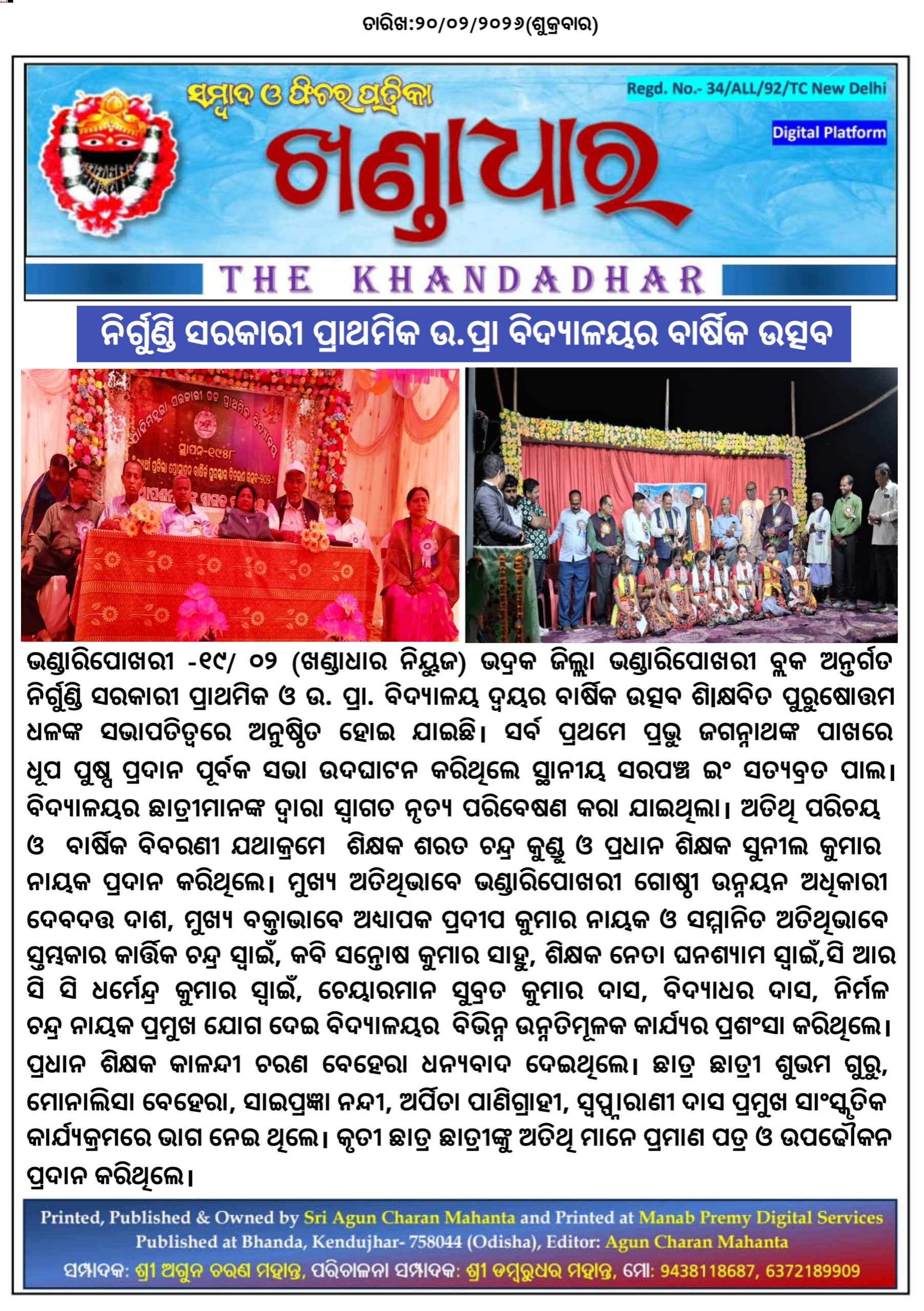 ଭଣ୍ଡାରିପୋଖରୀ -୧୯/ ୦୨ (ଖଣ୍ଡାଧାର ନିୟୁଜ)ଭଦ୍ରକ ଜିଲ୍ଲା ଭଣ୍ଡାରିପୋଖରୀ ବ୍ଲକ ଅନ୍ତର୍ଗତ ନିର୍ଗୁଣ୍ଡି ସରକାରୀ ପ୍ରାଥମିକ ଓ ଉ. ପ୍ରା. ବିଦ୍ୟାଳୟ ଦ୍ଵୟର ବାର୍ଷିକ ଉତ୍ସବ ଶିlକ୍ଷବିତ ପୁରୁଷୋତ୍ତମ ଧଳଙ୍କ ସଭାପତିତ୍ୱରେ ଅନୁଷ୍ଠିତ ହୋଇ ଯାଇଛି। ସର୍ବ ପ୍ରଥମେ ପ୍ରଭୁ ଜଗନ୍ନାଥଙ୍କ ପାଖରେ ଧୂପ ପୁଷ୍ପ ପ୍ରଦାନ ପୂର୍ବକ ସଭା ଉଦଘାଟନ କରିଥିଲେ ସ୍ଥାନୀୟ ସରପଞ୍ଚ ଇଂ ସତ୍ୟବ୍ରତ ପାଲ। ବିଦ୍ୟାଳୟର ଛାତ୍ରୀମାନଙ୍କ ଦ୍ୱାରା ସ୍ୱାଗତ ନୃତ୍ୟ ପରିବେଷଣ କରା ଯାଇଥିଲା। ଅତିଥି ପରିଚୟ ଓ ବାର୍ଷିକ ବିବରଣୀ ଯଥାକ୍ରମେ ଶିକ୍ଷକ ଶରତ ଚନ୍ଦ୍ର କୁଣ୍ଡୁ ଓ ପ୍ରଧାନ ଶିକ୍ଷକ ସୁନୀଲ କୁମାର ନାୟକ ପ୍ରଦାନ କରିଥିଲେ। ମୁଖ୍ୟ ଅତିଥିଭାବେ ଭଣ୍ଡାରିପୋଖରୀ ଗୋଷ୍ଠୀ ଉନ୍ନୟନ ଅଧିକାରୀ ଦେବଦତ୍ତ ଦାଶ, ମୁଖ୍ୟ ବକ୍ତାଭାବେ ଅଧ୍ୟାପକ ପ୍ରଦୀପ କୁମାର ନାୟକ ଓ ସମ୍ମାନିତ ଅତିଥିଭାବେ ସ୍ତମ୍ଭକାର କାର୍ତ୍ତିକ ଚନ୍ଦ୍ର ସ୍ୱାଇଁ,କବି ସନ୍ତୋଷ କୁମାର ସାହୁ, ଶିକ୍ଷକ ନେତା ଘନଶ୍ୟାମ ସ୍ୱାଇଁ,ସି ଆର ସି ସି ଧର୍ମେନ୍ଦ୍ର କୁମାର ସ୍ୱାଇଁ, ଚେୟାରମାନ ସୁବ୍ରତ କୁମାର ଦାସ, ବିଦ୍ୟାଧର ଦାସ, ନିର୍ମଳ ଚନ୍ଦ୍ର ନାୟକ ପ୍ରମୁଖ ଯୋଗ ଦେଇ ବିଦ୍ୟାଳୟର ବିଭିନ୍ନ ଉନ୍ନତିମୂଳକ କାର୍ଯ୍ୟର ପ୍ରଶଂସା କରିଥିଲେ। ପ୍ରଧାନ ଶିକ୍ଷକ କାଳନ୍ଦୀ ଚରଣ ବେହେରା ଧନ୍ୟବାଦ ଦେଇଥିଲେ। ଛାତ୍ର ଛାତ୍ରୀ ଶୁଭମ ଗୁରୁ, ମୋନାଲିସା ବେହେରା, ସାଇପ୍ରଜ୍ଞା ନନ୍ଦୀ, ଅର୍ପିତା ପାଣିଗ୍ରାହୀ, ସ୍ବପ୍ପ୍ନାରାଣୀ ଦାସ ପ୍ରମୁଖ ସାଂସ୍କୃତିକ କାର୍ଯ୍ୟକ୍ରମରେ ଭାଗ ନେଇ ଥିଲେ। କୃତୀ ଛାତ୍ର ଛାତ୍ରୀଙ୍କୁ ଅତିଥି ମାନେ ପ୍ରମାଣ ପତ୍ର ଓ ଉପଢୌକନ ପ୍ରଦାନ କରିଥିଲେ।