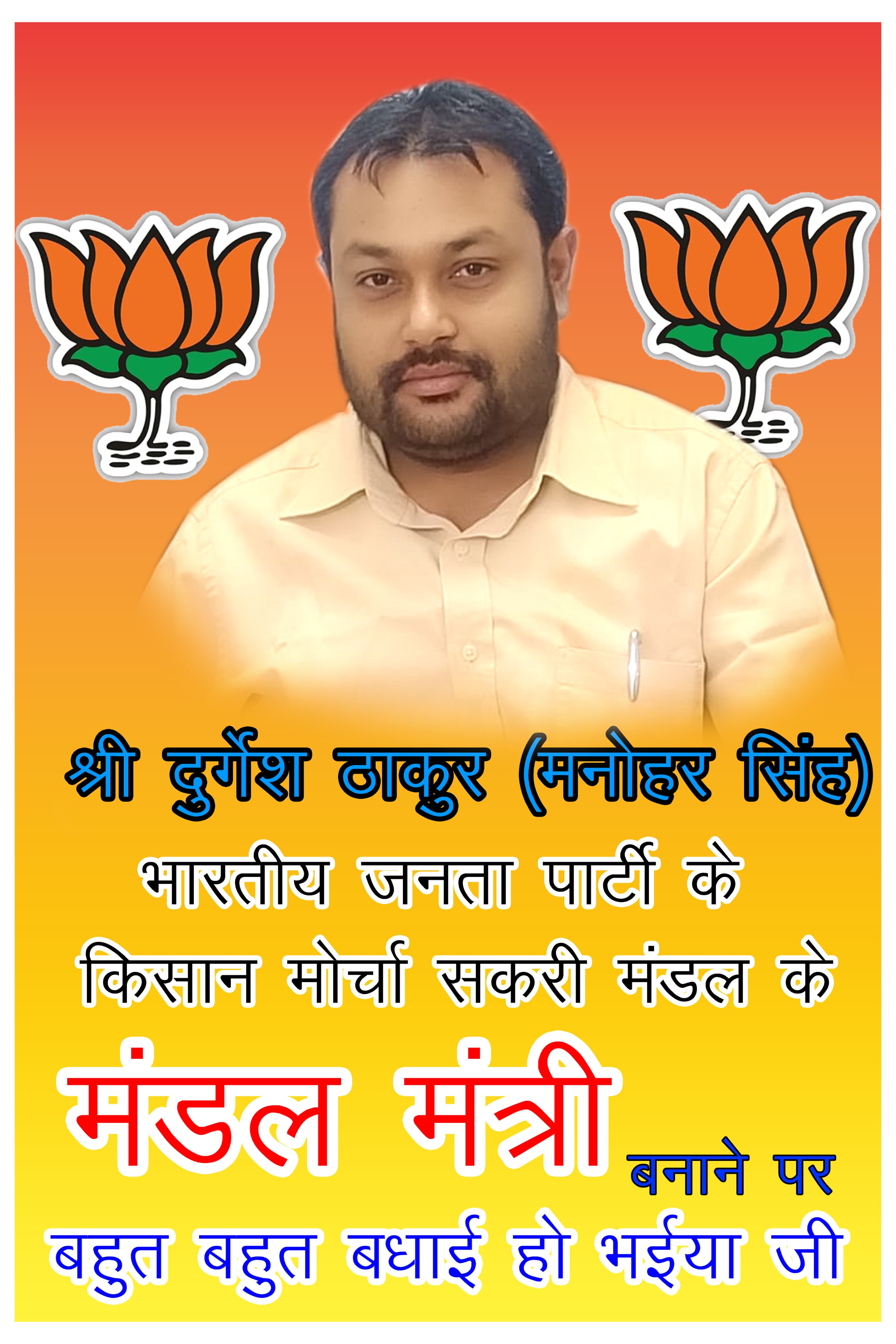 भारतीय जनता पार्टी जिला बिलासपुर शहरी छत्तीसगढ़ के अंतर्गत, भारतीय जनता पार्टी के प्रदेश अध्यक्ष माननीय किरण सिंह देव जी एवं भाजपा महामंत्री संगठन माननीय पवन साय जी के मार्गदर्शन में श्री दुर्गेश सिंह ठाकुर जी को भारतीय जनता पार्टी किसान मोर्चा, सकरी मंडल का मंडल मंत्री नियुक्त होने पर बहुत-बहुत हार्दिक शुभकामनाएं।