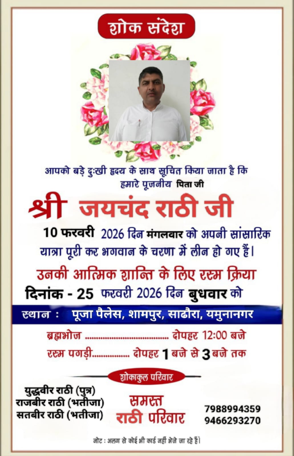 कपुरी :- गाँव श्यामपुर के निवासी एवं भारतीय राष्ट्रीय कांग्रेस के वरिष्ठ एवं समर्पित कार्यकर्ता *स्वर्गीय श्री जयचंद राठी जी* के आकस्मिक निधन का समाचार अत्यंत दुःखद है।