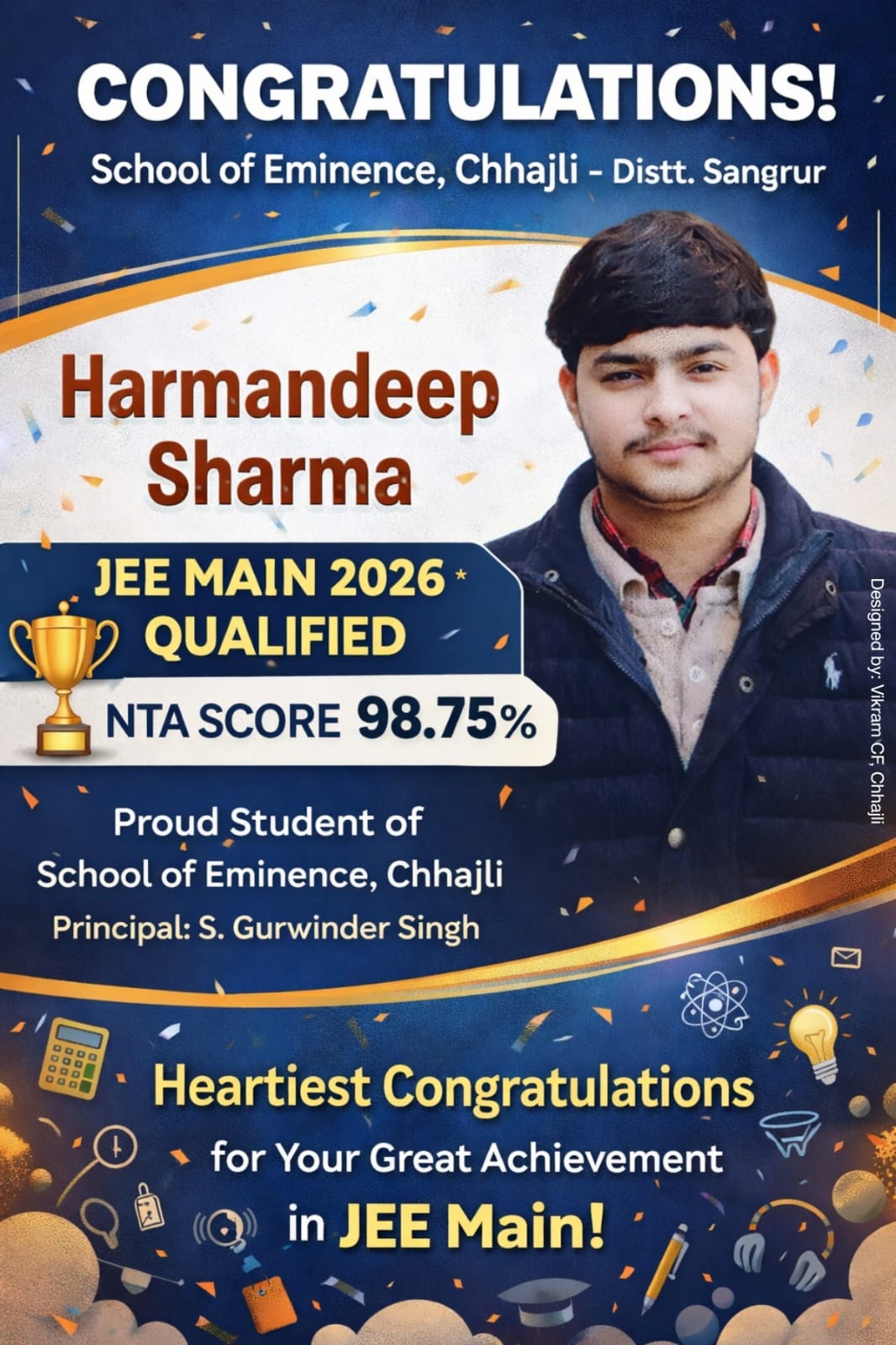 स्कूल ऑफ एमिनेंस छाजली के प्रिंसिपल गुरविंदर सिंह ने पत्रकार सुरेश जवाहर वाला को बताया कि अगर इरादे मजबूत हों तो बाहर महंगी कोचिंग की जरूरत नहीं पड़ती। इसका ताजा उदाहरण हमारे ही स्कूल का स्टूडेंट हरमनदीप शर्मा है, जिसने स्कूल स्टाफ से घर पर रहकर पढ़ाई की और टॉप पर आया, जो स्टूडेंट्स के लिए एक मिसाल है। यहां यह बताना ज़रूरी है कि नेशनल टेस्टिंग एजेंसी (NTA) की इंजीनियरिंग एंट्रेंस परीक्षा (JEE MAIN) 26 जनवरी को हुई थी, जिसमें देश भर से 13 लाख से ज़्यादा स्टूडेंट्स ने हिस्सा लिया था, जिसका रिज़ल्ट 16 फरवरी, 2026 को आया था। इस समय जब पिता तेजिंदर शर्मा (रिंकू) से बात की गई, तो उन्होंने बताया कि उनके बेटे की प्रेग्नेंसी है। जिसने घर बैठकर अपनी पढ़ाई की है और वह अब JEE एडवांस्ड की परीक्षा देगा। इस मौके पर हरमनदीप शर्मा को स्कूल स्टाफ़ ने सम्मानित किया।