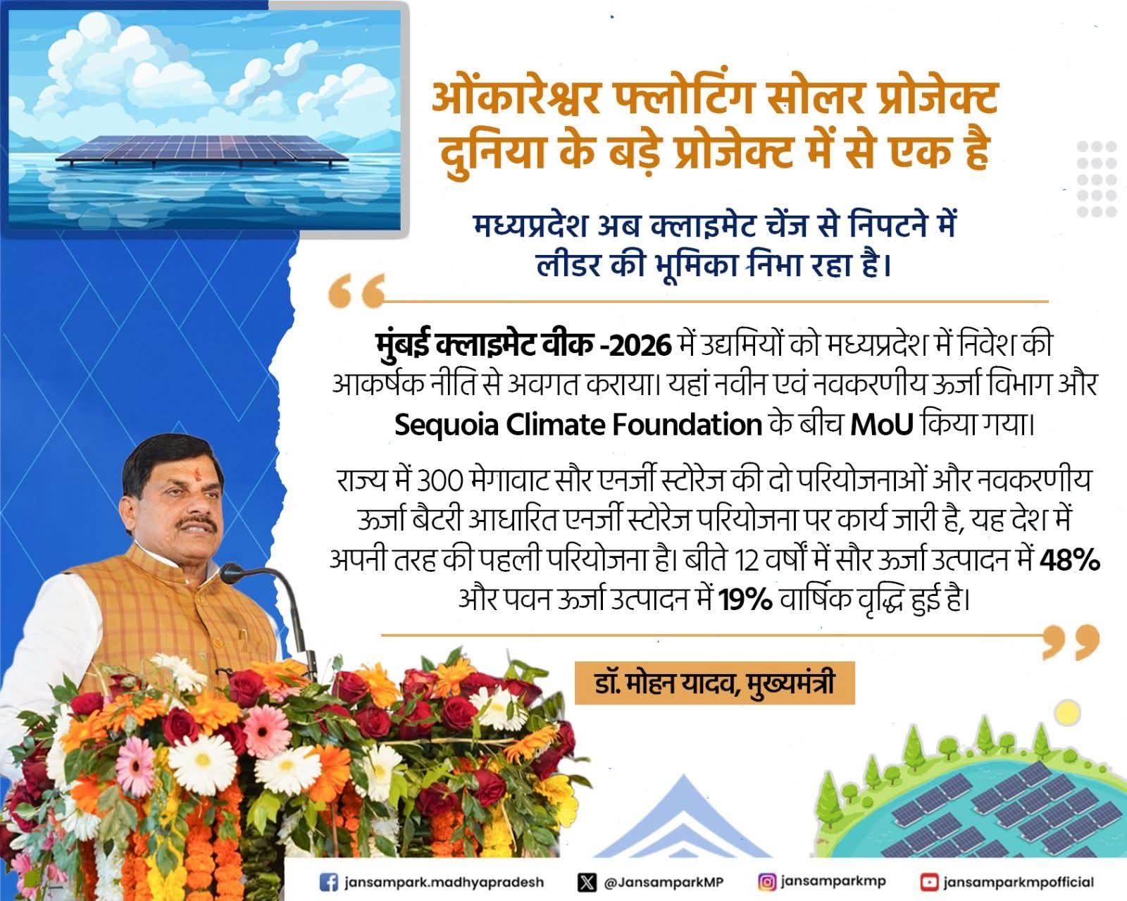 मध्यप्रदेश अब क्लाइमेट चेंज से निपटने में लीडर की भूमिका निभा रहा है। ‘मुंबई क्लाइमेट वीक -2026’ में उद्यमियों को मध्यप्रदेश में निवेश की आकर्षक नीति से अवगत कराया। यहां नवीन एवं नवकरणीय ऊर्जा विभाग और Sequoia Climate Foundation के बीच MoU किया गया।