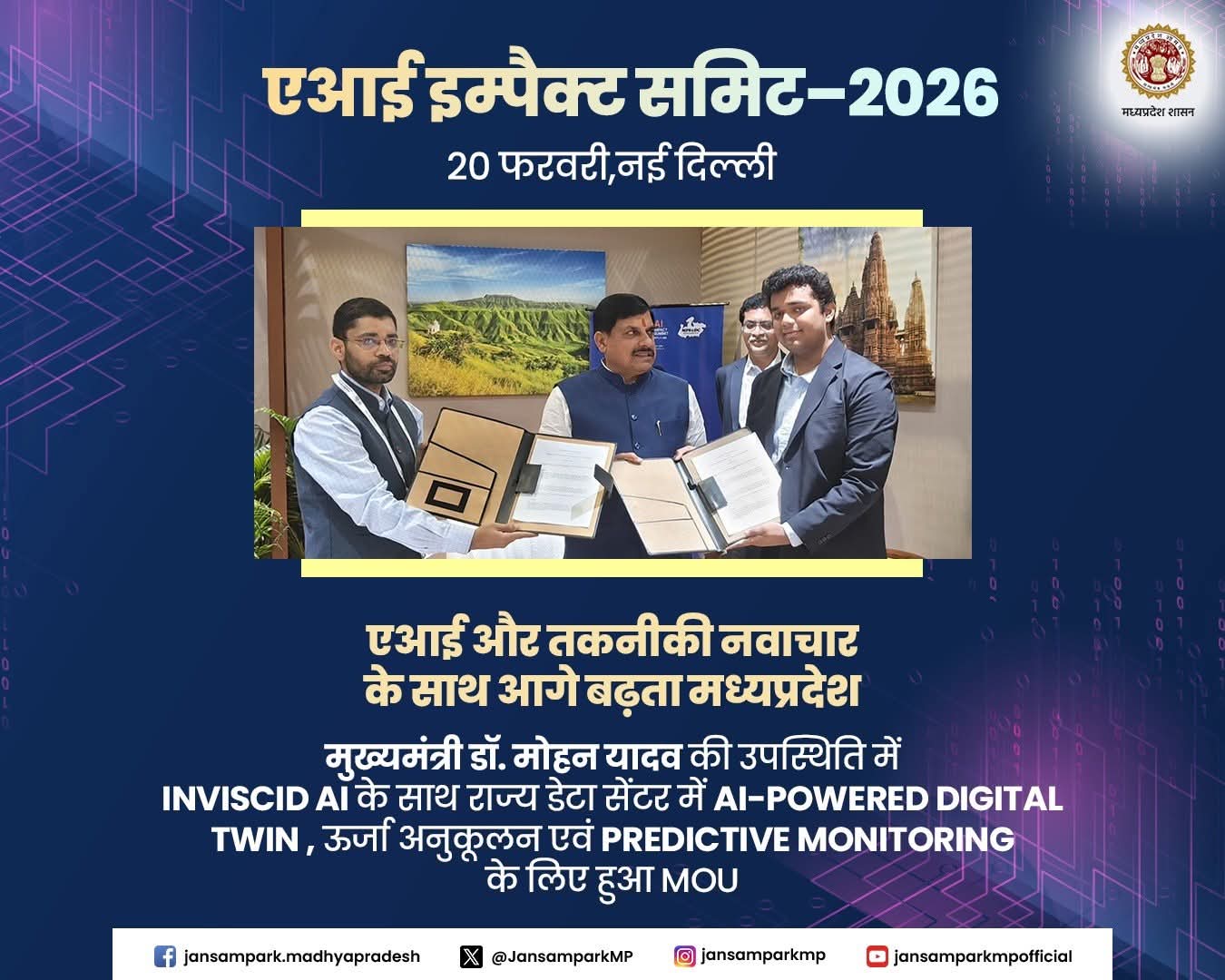 मुख्यमंत्री डॉ. मोहन यादव की उपस्थिति में Inviscid AI के साथ राज्य डेटा सेंटर में AI-powered Digital Twin , ऊर्जा अनुकूलन एवं Predictive Monitoring के लिए हुआ MoU