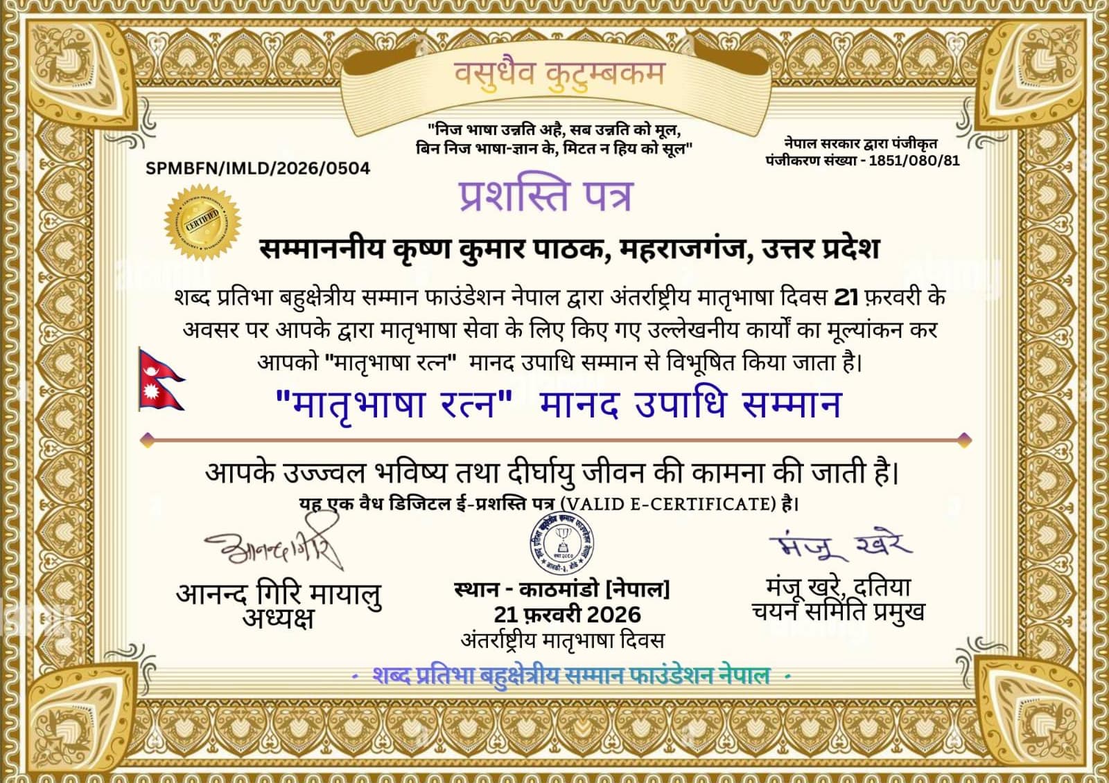 नेपाल की संस्था शब्द प्रतिभा बहूक्षेत्रीय सम्मान फाउंडेशन द्वारा पत्रकार एवं लेखक कृष्ण कुमार पाठक "मातृभाषा रत्न"