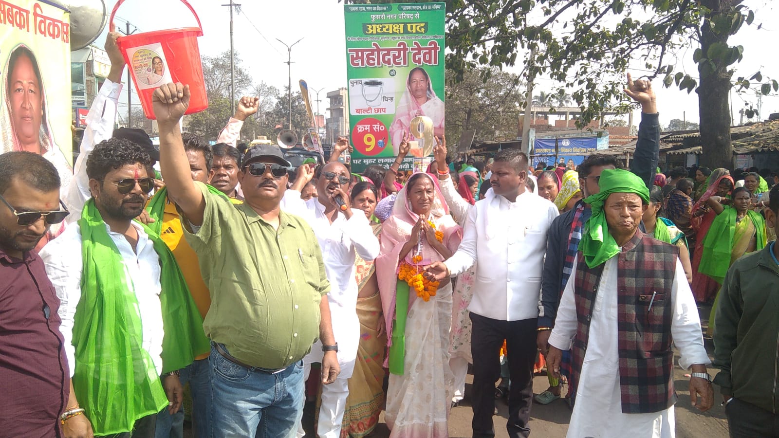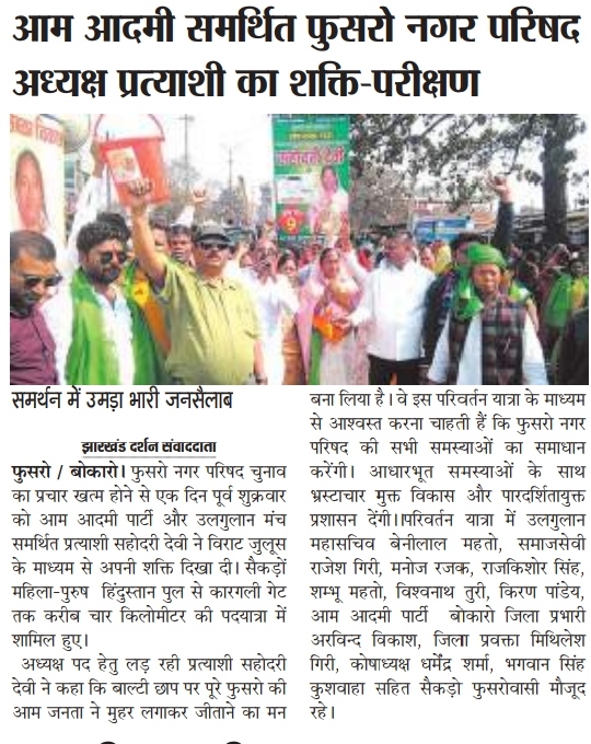 फुसरो नगर परिषद चुनाव का प्रचार खत्म होने से एक दिन पूर्व शुक्रवार को आम आदमी पार्टी और उलगुलान मंच समर्थित प्रत्याशी सहोदरी देवी ने विराट जुलूस के माध्यम से अपनी शक्ति दिखा दी। सैकड़ों महिला-पुरुष हिंदुस्तान पुल से कारगली गेट तक करीब चार किलोमीटर की पदयात्रा में शामिल हुए। अध्यक्ष पद हेतु लड़ रही प्रत्याशी सहोदरी देवी ने कहा कि बाल्टी छाप पर पूरे फुसरो की आम जनता ने मुहर लगाकर जीताने का मन बना लिया है। वे इस परिवर्तन यात्रा के माध्यम से आश्वस्त करना चाहती हैं कि फुसरो नगर परिषद की सभी समस्याओं का समाधान करेंगी। आधारभूत समस्याओं के साथ भ्रस्टाचार मुक्त विकास और पारदर्शितायुक्त प्रशासन देंगी।