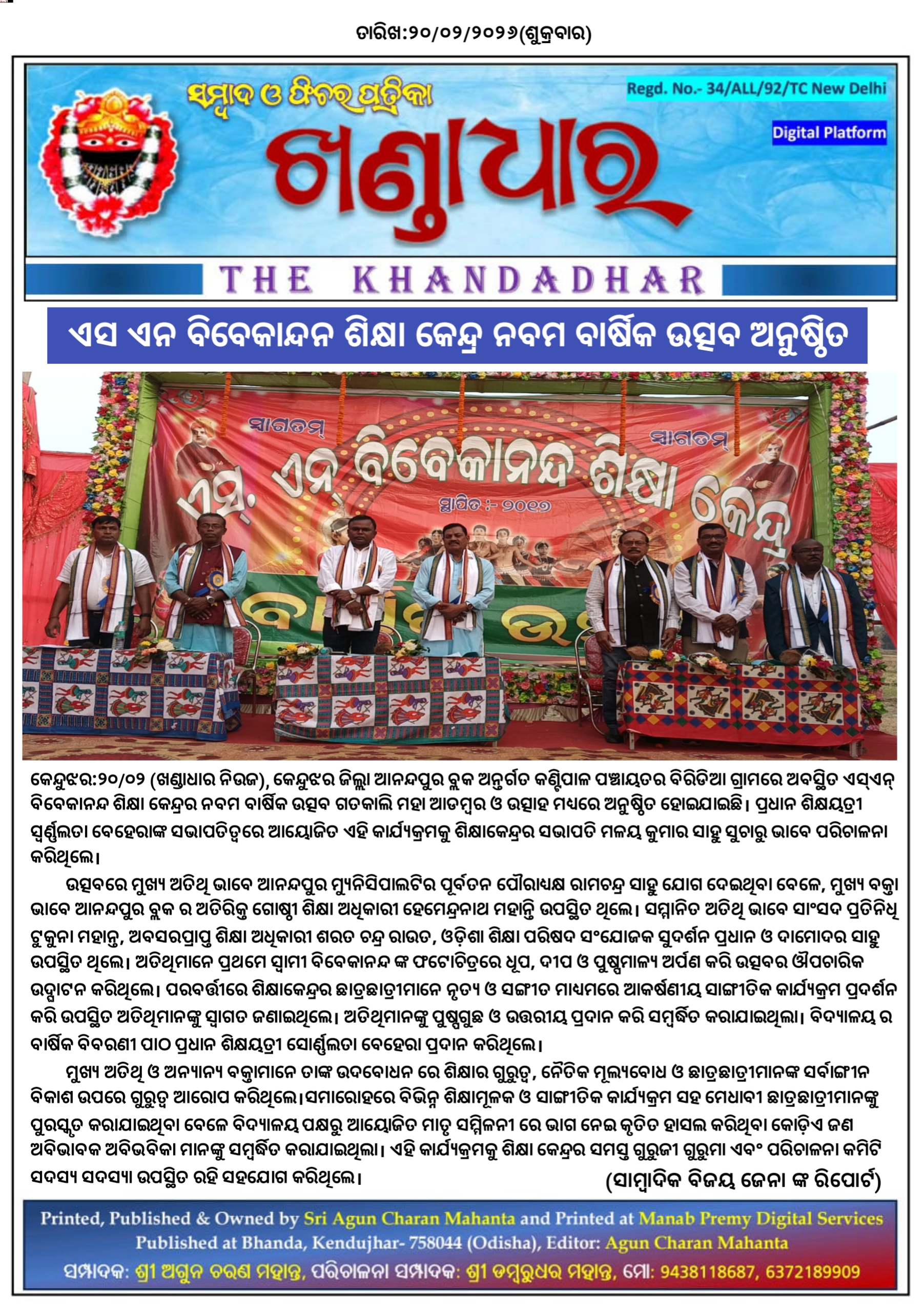 କେନ୍ଦୁଝର:୨୦/୦୨, କେନ୍ଦୁଝର ଜିଲ୍ଲା ଆନନ୍ଦପୁର ବ୍ଲକ ଅନ୍ତର୍ଗତ କଣ୍ଟିପାଳ ପଞ୍ଚାୟତର ବିରିଡିଆ ଗ୍ରାମରେ ଅବସ୍ଥିତ ଏସ୍ଏନ୍ ବିବେକାନନ୍ଦ ଶିକ୍ଷା କେନ୍ଦ୍ରର ନବମ ବାର୍ଷିକ ଉତ୍ସବ ଗତକାଲି ମହା ଆଡମ୍ବର ଓ ଉତ୍ସାହ ମଧ୍ୟରେ ଅନୁଷ୍ଠିତ ହୋଇଯାଇଛି। ପ୍ରଧାନ ଶିକ୍ଷୟତ୍ରୀ ସ୍ୱର୍ଣ୍ଣଲତା ବେହେରାଙ୍କ ସଭାପତିତ୍ୱରେ ଆୟୋଜିତ ଏହି କାର୍ଯ୍ୟକ୍ରମକୁ ଶିକ୍ଷାକେନ୍ଦ୍ରର ସଭାପତି ମଳୟ କୁମାର ସାହୁ ସୁଚାରୁ ଭାବେ ପରିଚାଳନା କରିଥିଲେ।