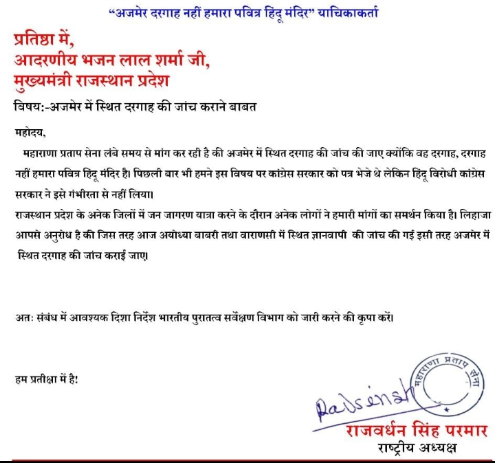 महाराणा प्रताप सेना के राष्ट्रीय अध्यक्ष डॉ. राजवर्धन सिंह परमार ने अजमेर को लेकर एक बड़ा और विवादास्पद बयान दिया है।