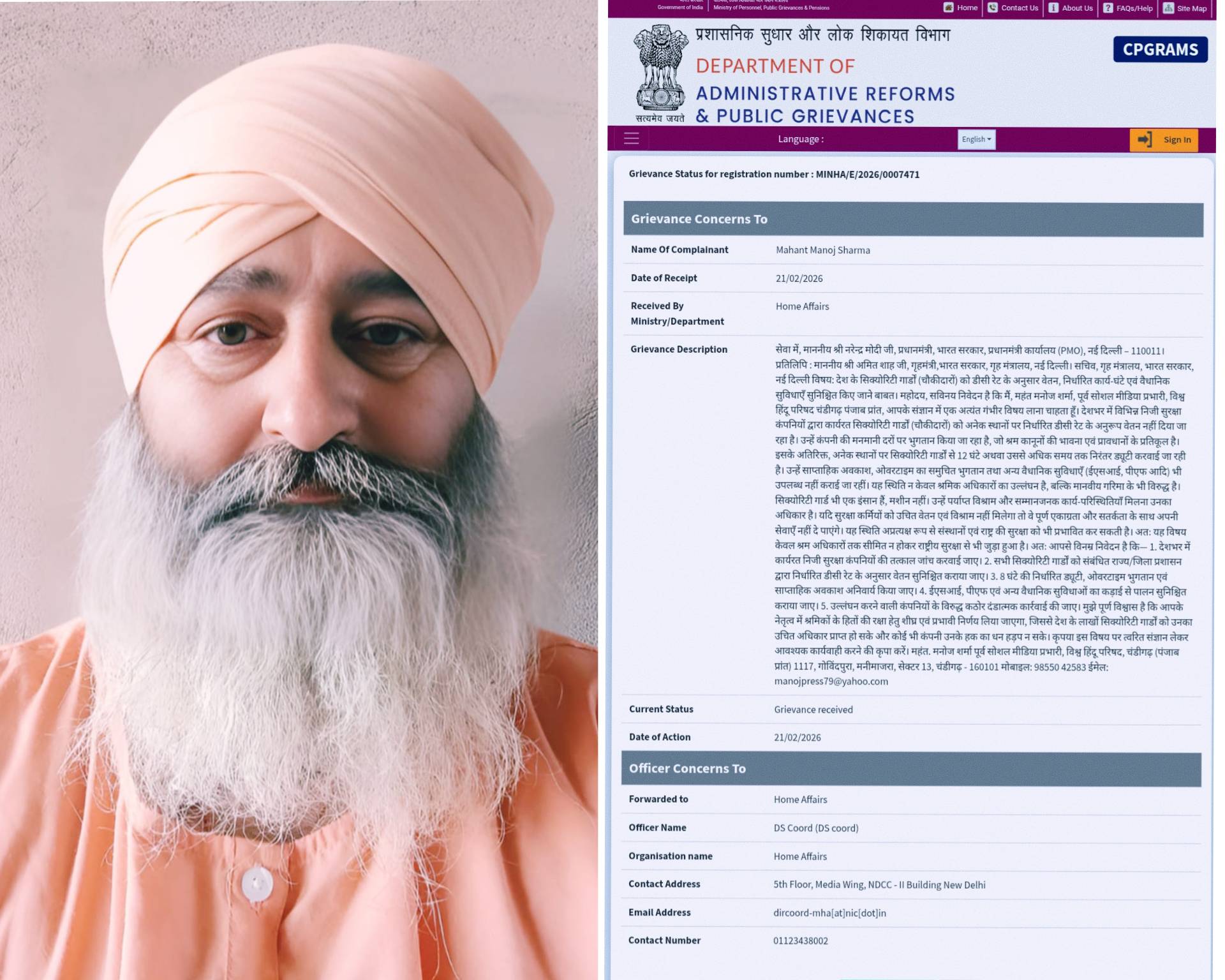 चंडीगढ़। विश्व हिंदू परिषद चंडीगढ़ (पंजाब प्रांत) के पूर्व सोशल मीडिया प्रभारी महंत मनोज शर्मा ने देशभर में कार्यरत सिक्योरिटी गार्डों (चौकीदारों) के हितों की रक्षा को लेकर प्रधानमंत्री श्री नरेंद्र मोदी और गृहमंत्री श्री अमित शाह को पत्र लिखकर हस्तक्षेप की मांग की है।