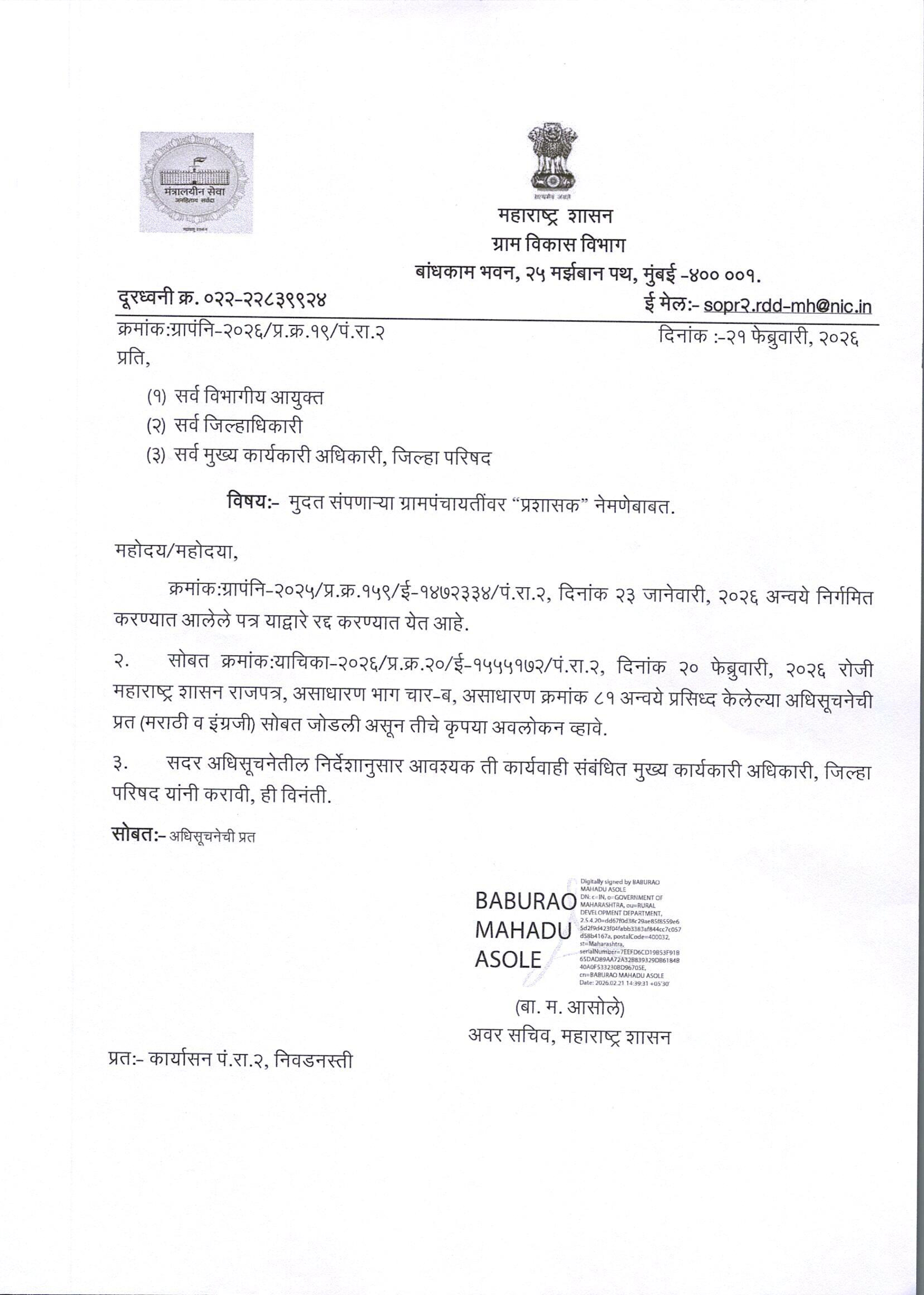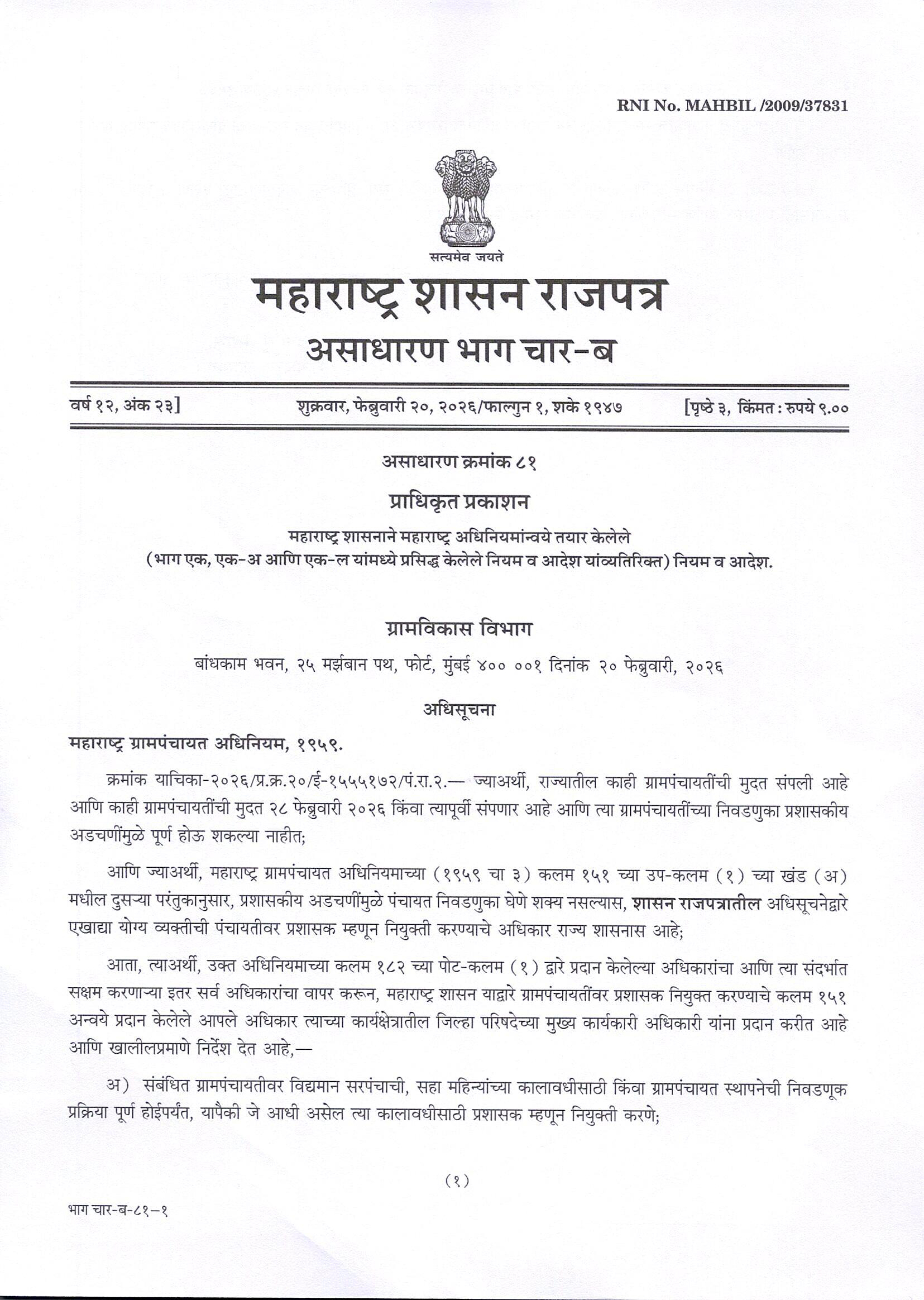 महारष्ट्र शासनाचे दि. २० फेब्रुवारी २०२६ च्या राजपत्रानुसार व ग्राम विकास विभाग यांच्याकडील दि. २१ फेब्रुवारी २०२६ च्या पत्रानुसार मुदत संपणाऱ्या ग्रामपंचायती साठी सहा महिने कालावधीसाठी किंवा ग्रामपंचायत निवडणूक होईपर्यंत सरपंच हेच असणार प्रशासक असणार आहेत तसेच ग्रामपंचायत सदस्य हे प्रशासकीय मंडल सदस्य असणार आहेत ...
