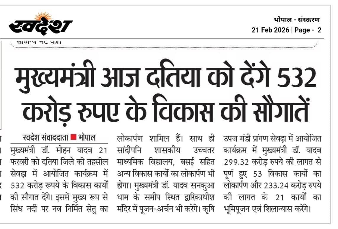 मुख्यमंत्री डॉ. मोहन यादव आज दतिया को देंगे ₹532 करोड़ के विकास की सौगातें