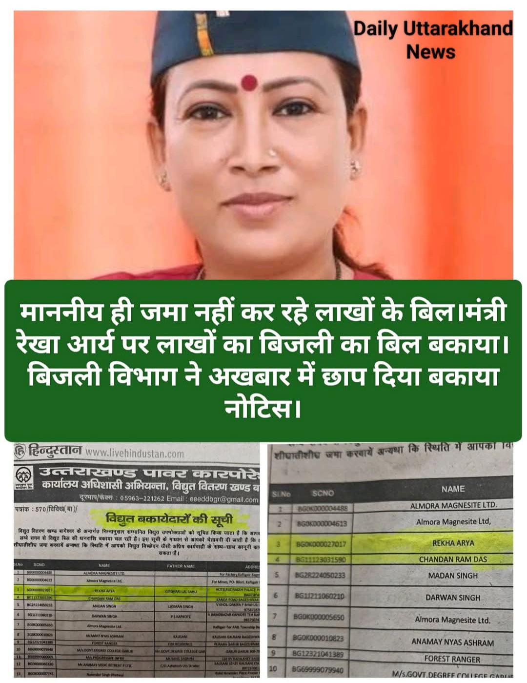 मंत्री रेखा आर्या पर 2.98 लाख रुपये बिजली बिल बकाया होने का खुलासा।