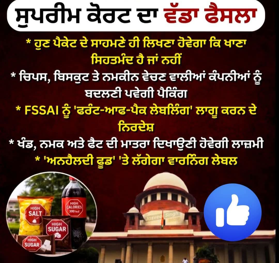 ਭਾਰਤ ਦੀ ਸਰਵਉੱਚ ਅਦਾਲਤ ਸੁਪਰੀਮ ਕੋਰਟ ਵਲੋ ਖਾਣ-ਪੀਣ ਵਾਲੀਆ ਵਸਤੂਆਂ ਬਣਾਉਣ ਵਾਲੀਆ ਕੰਪਨੀਆ ਨੂੰ ਸਖਤ ਦਿਸਾ ਨਿਰਦੇਸ਼ ਜਾਰੀ ਕੀਤੇ ਹਨ ਜਿਸਦੇ ਤਹਿਤ ਕੰਪਨੀਆ ਨੂੰ ਪੈਕਿੰਗ ਉਪਰ ਹਰ ਨਿਕੀ ਤੇ ਅਹਿਮ ਜਾਣਕਾਰੀ ਕਰਨੀ ਪਵੇਗੀ ਜਨਤਕ! ਖੰਡ, ਨਮਕ,ਫੈਟ ਆਦਿ ਦੀ ਮਾਤਰਾ ਦਿਖਾਉਣੀ ਹੋਵੇਗੀ ਲਾਜਮੀ, ਨਾਲ ਹੀ FSSAI ਨੂੰ ਫਰੰਟ-ਆਫ-ਪੈਕ ਲੈਬਲਿੰਗ ਲਾਗੂ ਕਰਨ ਦੇ ਦਿੱਤੇ ਆਦੇਸ਼!