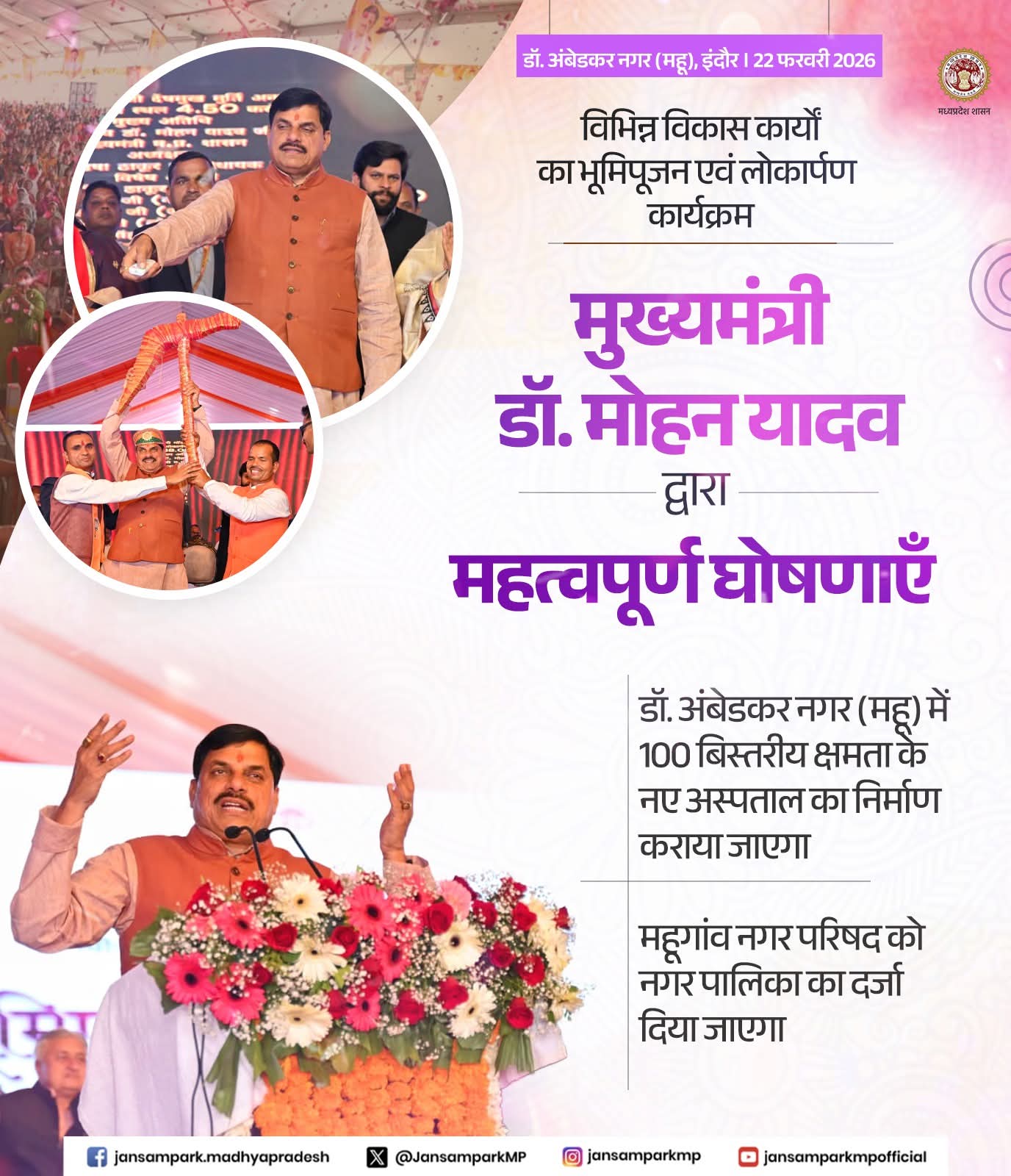 मुख्यमंत्री डॉ. मोहन यादव द्वारा इंदौर के डॉ. अंबेडकर नगर (महू) में आयोजित विभिन्न विकास कार्यों के लोकार्पण एवं भूमिपूजन कार्यक्रम में सहभागिता