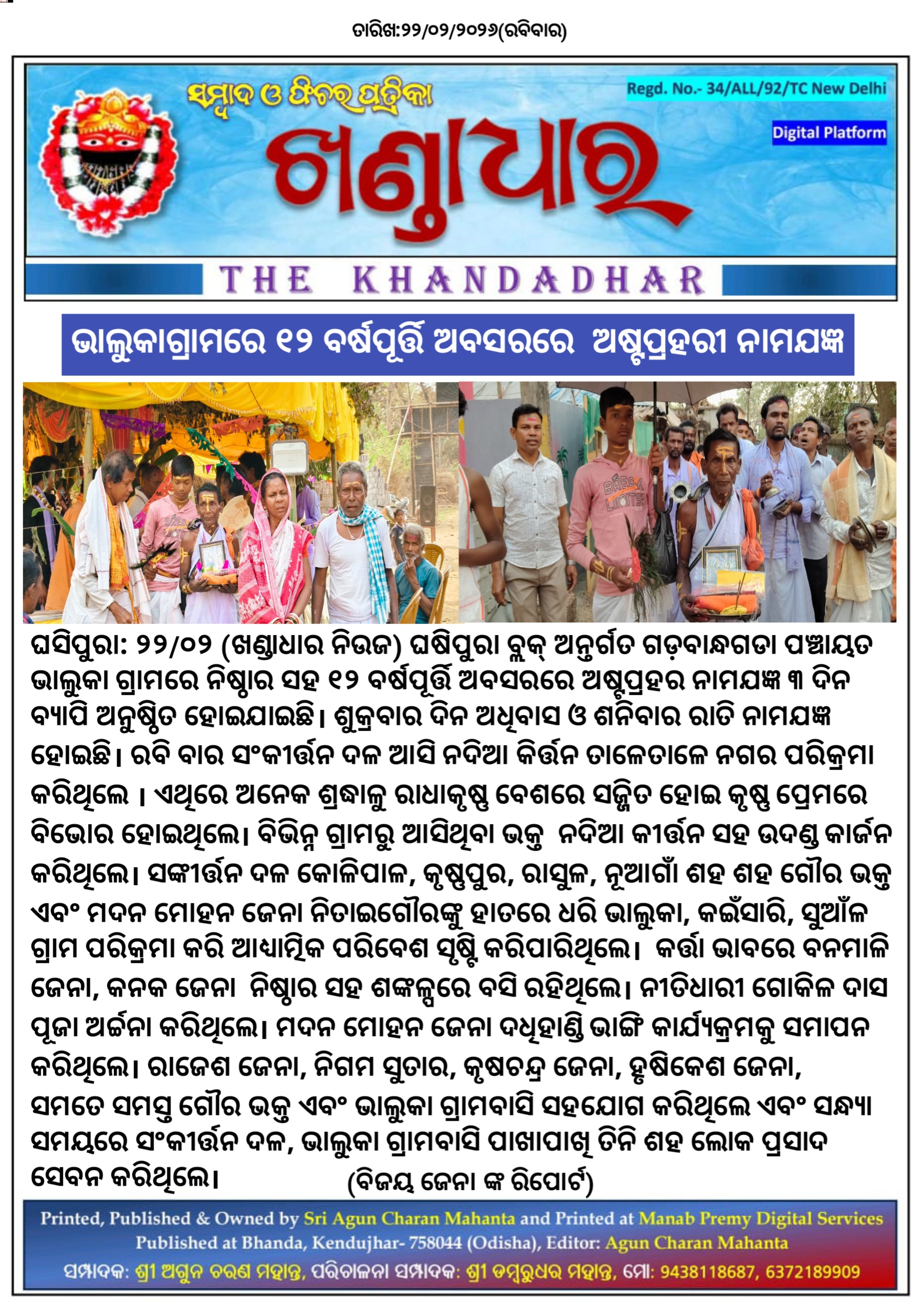 ଘଷିପୁରା: ୨୨/୦୨, ଘସିପୁରା ବ୍ଲକ୍ ଅନ୍ତର୍ଗତ ଗଡ଼ବାନ୍ଧଗଡା ପଞ୍ଚାୟତ ଭାଲୁକା ଗ୍ରାମରେ ନିଷ୍ଠାର ସହ ୧୨ବର୍ଷପୂର୍ତ୍ତି ଅବସରରେ ଅଷ୍ଟପ୍ରହର ନାମଯଜ୍ଞ ୩ ଦିନ ବ୍ୟାପି ଅନୁଷ୍ଠିତ ହୋଇଯାଇଛି। ଶୁକ୍ରବାର ଦିନ ଅବାସ ଓ ଶନିବାର ରାତି ନାମଯଜ୍ଞ ହୋଇଛି। ରବି ବାର ସଂକୀର୍ତ୍ତନ ଦଳ ଆସି ନଦିଆ କିର୍ତ୍ତନ ତାଳେତାଳେ ନଗର ପରିକ୍ରମା କରିଥିଲେ । ଏଥିରେ ଅନେକ ଶ୍ରଦ୍ଧାଳୁ ରାଧାକୃଷ୍ଣ ବେଶରେ ସଜ୍ଜିତ ହୋଇ କୃଷ୍ଣ ପ୍ରେମରେ ବିଭୋର ହୋଇଥିଲେ। ବିଭିନ୍ନ ଗ୍ରାମରୁ ଆସିଥିବା ଭକ୍ତ ନଦିଆ କୀର୍ତ୍ତନ ସହ ଉଦଣ୍ଡ କାର୍ଜନ କରିଥିଲେ। ସଙ୍କୀର୍ତ୍ତନ ଦଳ କୋଳିପାଳ, କୃଷ୍ଣପୁର, ରାସୁଳ, ନୂଆଗାଁ ଶହ ଶହ ଗୌର ଭକ୍ତ ଏବଂ ମଦନ ମୋହନ ଜେନା ନିତାଇଗୌରଙ୍କୁ ହାତରେ ଧରି ଭାଲୁକା, କଇଁସାରି, ସୁଆଁଳ ଗ୍ରାମ ପରିକ୍ରମା କରି ଆଧ୍ୟାତ୍ମିକ ପରିବେଶ ସୃଷ୍ଟି କରିପାରିଥିଲେ । କର୍ତା ଭାବରେ ବନମାଳି ଜେନା, କନକ ଜେନା ନିଷ୍ଠାର ସହ ଶଙ୍ଖଳ୍ପରେ ବସି ରହିଥିଲେ । ତିନିଧାରୀ ଗୋକିଳ ଦାସ ପୂଜା ଅର୍ଚ୍ଚନା କରିଥିଲେ। ମଦନ ମୋହନ ଜେନା ଦଧିହାଣ୍ଡି ଭାଙ୍ଗି କାର୍ଯ୍ୟକ୍ରମକୁ ସମାପନ କରିଥିଲେ। ରାଜେଶ ଜେନା, ନିଗମ ସୁତାର, କୃଷଚନ୍ଦ୍ର ଜେନା, ହୃଷିକେଶ ଜେନା,ସମତେ ସମସ୍ତ ଗୌର ଭକ୍ତ ଏବଂ ଭାଲୁକା ଗ୍ରାମବାସି ସହଯୋଗ କରିଥିଲେ ଏବଂ ସନ୍ଧ୍ୟା ସମୟରେ ସଂକୀର୍ତ୍ତନ ଦଳ, ଭାଲୁକା ଗ୍ରାମବାସି ପାଖାପାଖି ତିନି ଶହ ଲୋକ ପ୍ରସାଦ ସେବନ କରିଥିଲେ।