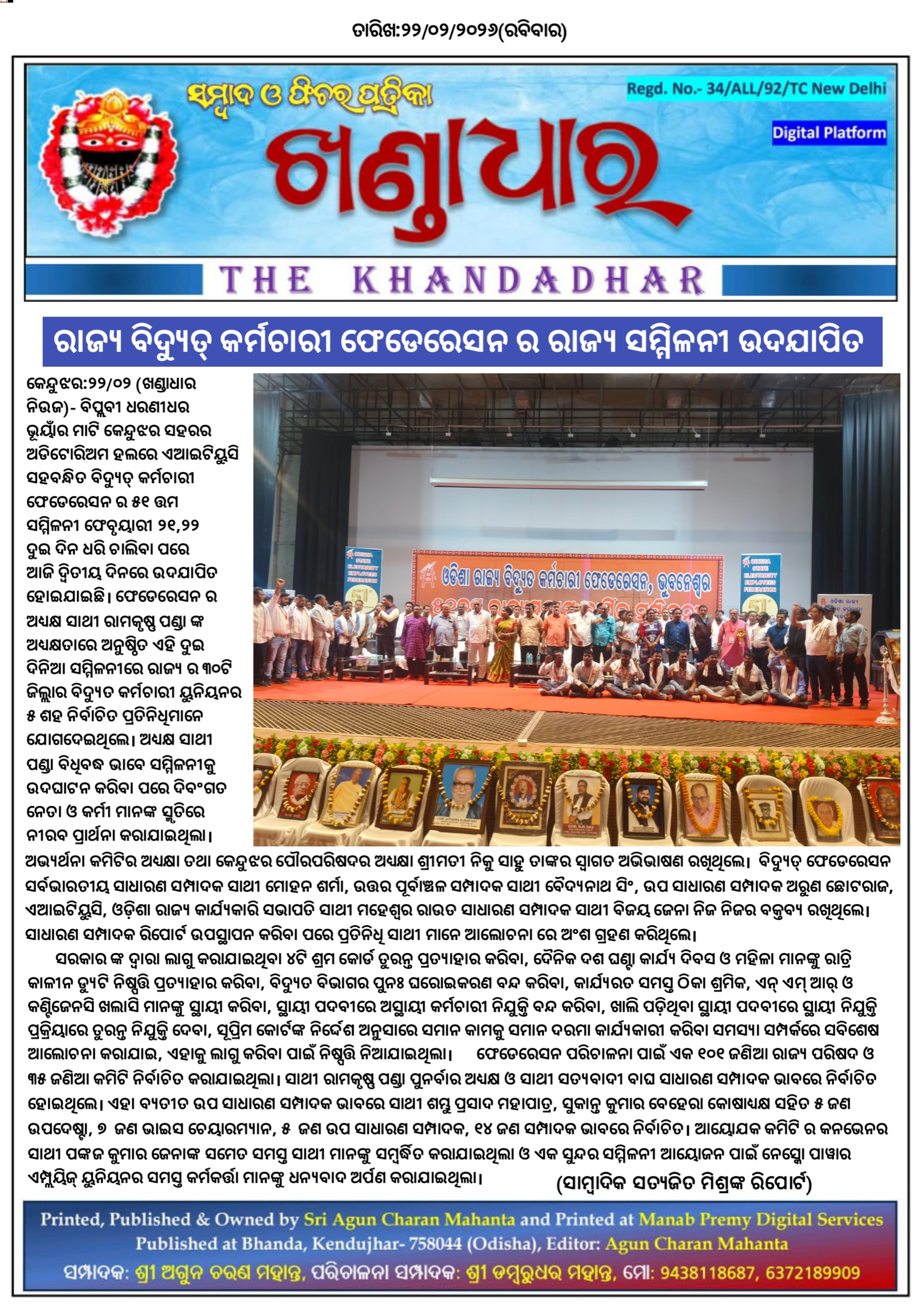 କେନ୍ଦୁଝର:୨୨/୦୨, - ବିପ୍ଲବୀ ଧରଣୀଧର ଭୂୟାଁର ମାଟି କେନ୍ଦୁଝର ସହରର ଅଡିଟୋରିଅମ ହଲରେ ଏଆଇଟିୟୁସି ସହବନ୍ଧିତ ବିଦ୍ୟୁତ୍ କର୍ମଚାରୀ ଫେଡେରେସନ ର ୫୧ ତ୍ତମ ସମ୍ମିଳନୀ ଫେବୃୟାରୀ ୨୧,୨୨ ଦୁଇ ଦିନ ଧରି ଚାଲିବା ପରେ ଆଜି ଦ୍ୱିତୀୟ ଦିନରେ ଉଦଯାପିତ ହୋଇଯାଇଛି। ଫେଡେରେସନ ର ଅଧ୍ୟକ୍ଷ ସାଥୀ ରାମକୃଷ୍ଣ ପଣ୍ଡା ଙ୍କ ଅଧ୍ୟକ୍ଷତାରେ ଅନୁଷ୍ଠିତ ଏହି ଦୁଇ ଦିନିଆ ସମ୍ମିଳନୀରେ ରାଜ୍ୟ ର ୩୦ଟି ଜିଲ୍ଲାର ବିଦ୍ୟୁତ କର୍ମଚାରୀ ୟୁନିୟନର ୫ ଶହ ନିର୍ବାଚିତ ପ୍ରତିନିଧିମାନେ ଯୋଗଦେଇଥିଲେ। ଅଧ୍ୟକ୍ଷ ସାଥୀ ପଣ୍ଡା ବିଧିବଦ୍ଧ ଭାବେ ସମ୍ମିଳନୀକୁ ଉଦଘାଟନ କରିବା ପରେ ଦିବଂଗତ ନେତା ଓ କର୍ମୀ ମାନଙ୍କ ସ୍ମୃତିରେ ନୀରବ ପ୍ରାର୍ଥନା କରାଯାଇଥିଲା। ଅଭ୍ୟର୍ଥନା କମିଟିର ଅଧ୍ୟକ୍ଷା ତଥା କେନ୍ଦୁଝର ପୌରପରିଷଦର ଅଧ୍ୟକ୍ଷା ଶ୍ରୀମତୀ ନିକୁ ସାହୁ ତାଙ୍କର ସ୍ବାଗତ ଅଭିଭାଷଣ ରଖିଥିଲେ। ବିଦ୍ୟୁତ୍ ଫେଡେରେସନ ସର୍ବଭାରତୀୟ ସାଧାରଣ ସମ୍ପାଦକ ସାଥୀ ମୋହନ ଶର୍ମା, ଉତ୍ତର ପୂର୍ବାଞ୍ଚଳ ସମ୍ପାଦକ ସାଥୀ ବୈଦ୍ୟନାଥ ସିଂ, ଉପ ସାଧାରଣ ସମ୍ପାଦକ ଅରୁଣ ଛୋଟରାଜ, ଏଆଇଟିୟୁସି, ଓଡ଼ିଶା ରାଜ୍ୟ କାର୍ଯ୍ୟକାରି ସଭାପତି ସାଥୀ ମହେଶ୍ବର ରାଉତ ସାଧାରଣ ସମ୍ପାଦକ ସାଥୀ ବିଜୟ ଜେନା ନିଜ ନିଜର ବକ୍ତବ୍ୟ ରଖିଥିଲେ। ସାଧାରଣ ସମ୍ପାଦକ ରିପୋର୍ଟ ଉପସ୍ଥାପନ କରିବା ପରେ ପ୍ରତିନିଧି ସାଥୀ ମାନେ ଆଲୋଚନା ରେ ଅଂଶ ଗ୍ରହଣ କରିଥିଲେ।