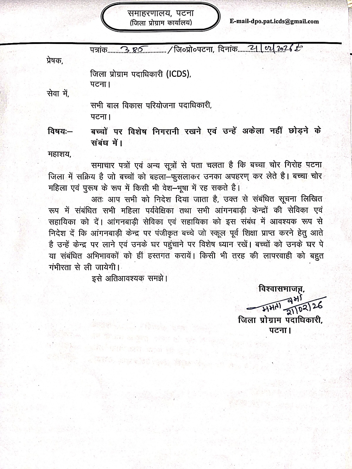 पटना जिले में बच्चों की सुरक्षा को लेकर प्रशासन ने सख्ती बढ़ा दी है। जिला कार्यक्रम कार्यालय (ICDS) की ओर से जारी निर्देश में सभी बाल विकास परियोजना पदाधिकारियों और आंगनबाड़ी केंद्रों को सतर्क रहने को कहा गया है। हाल के दिनों में समाचार माध्यमों और अन्य स्रोतों से यह संकेत मिले हैं कि जिले में बच्चों को बहला-फुसलाकर ले जाने वाले गिरोह सक्रिय हो सकते हैं। इसे गंभीरता से लेते हुए प्रशासन ने एहतियाती कदम उठाए हैं।