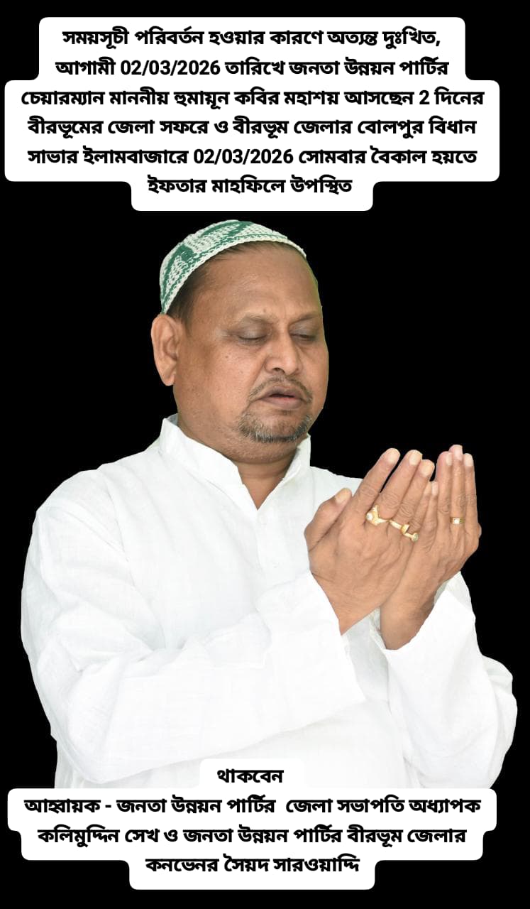 আগামী 02/03/2026 তারিখে জনতা উন্নয়ন পার্টির চেয়ারম্যান মাননীয় হুমায়ূন কবির মহাশয় আসছেন 2 দিনের বীরভূমের জেলা সফরে ও বীরভূম জেলার বোলপুর বিধান সাভার ইলামবাজারে 02/03/2026 সোমবার বৈকাল হয়তে ইফতার মাহফিলে উপস্থিত থাকবেন