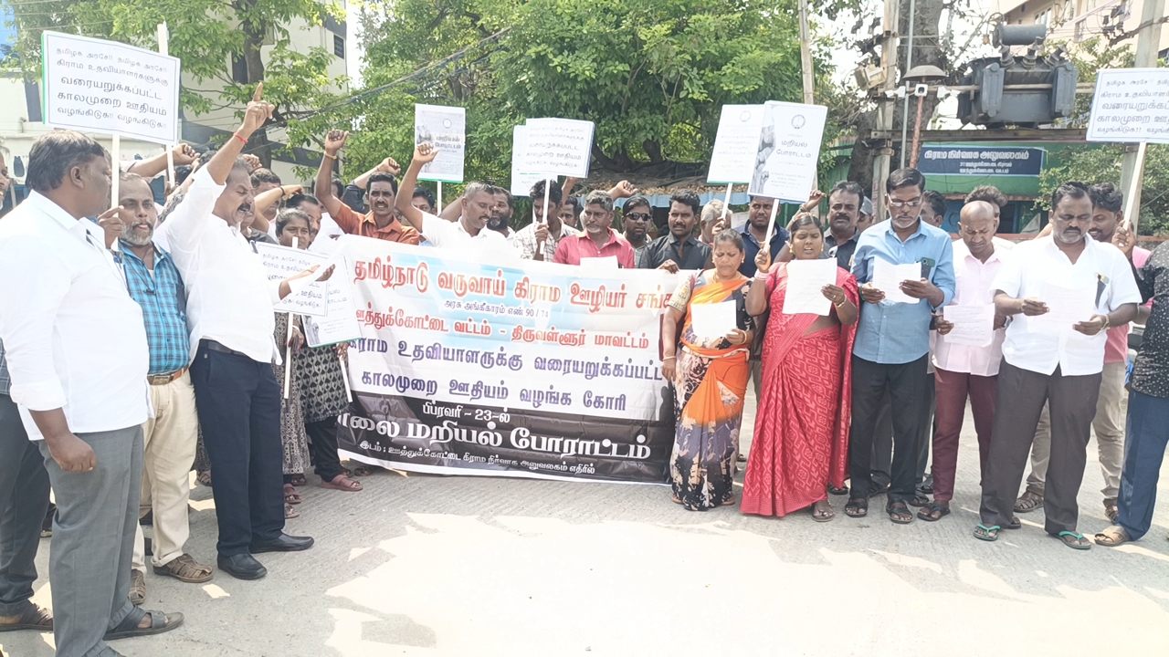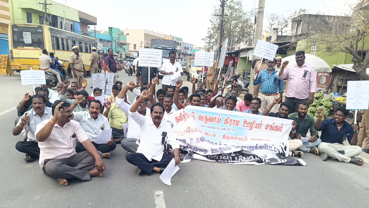 திருவள்ளூர் மாவட்டம் ஊத்துக்கோட்டையில் தமிழ்நாடு வருவாய் கிராம ஊழியர் சங்கம் சார்பில் மாவட்டத் தலைவர் அருள் தலைமையில் 45 வருவாய் கிராம ஊழியர்கள் வரையறுக்கப்பட்ட காலமுறை ஊதியத்தை வழங்க வேண்டியும், சிறப்பு முறை கால முறை ஊதியத்தில் இருந்து நீக்க வேண்டி கோரிக்கை முன்வைத்து ஊத்துக்கோட்டை பெரியபாளையம் சாலையில் மறியலில் ஈடுபட்டனர் இதனால் சிறிது நேரம் பரபரப்பு ஏற்பட்டது . பின்னர் காவல் துறையினரால் பேருந்தில் அழைத்துச் செல்லப்பட்டு தனியார் திருமண மண்டபத்தில் வைக்கப்பட்டுள்ளனர்.